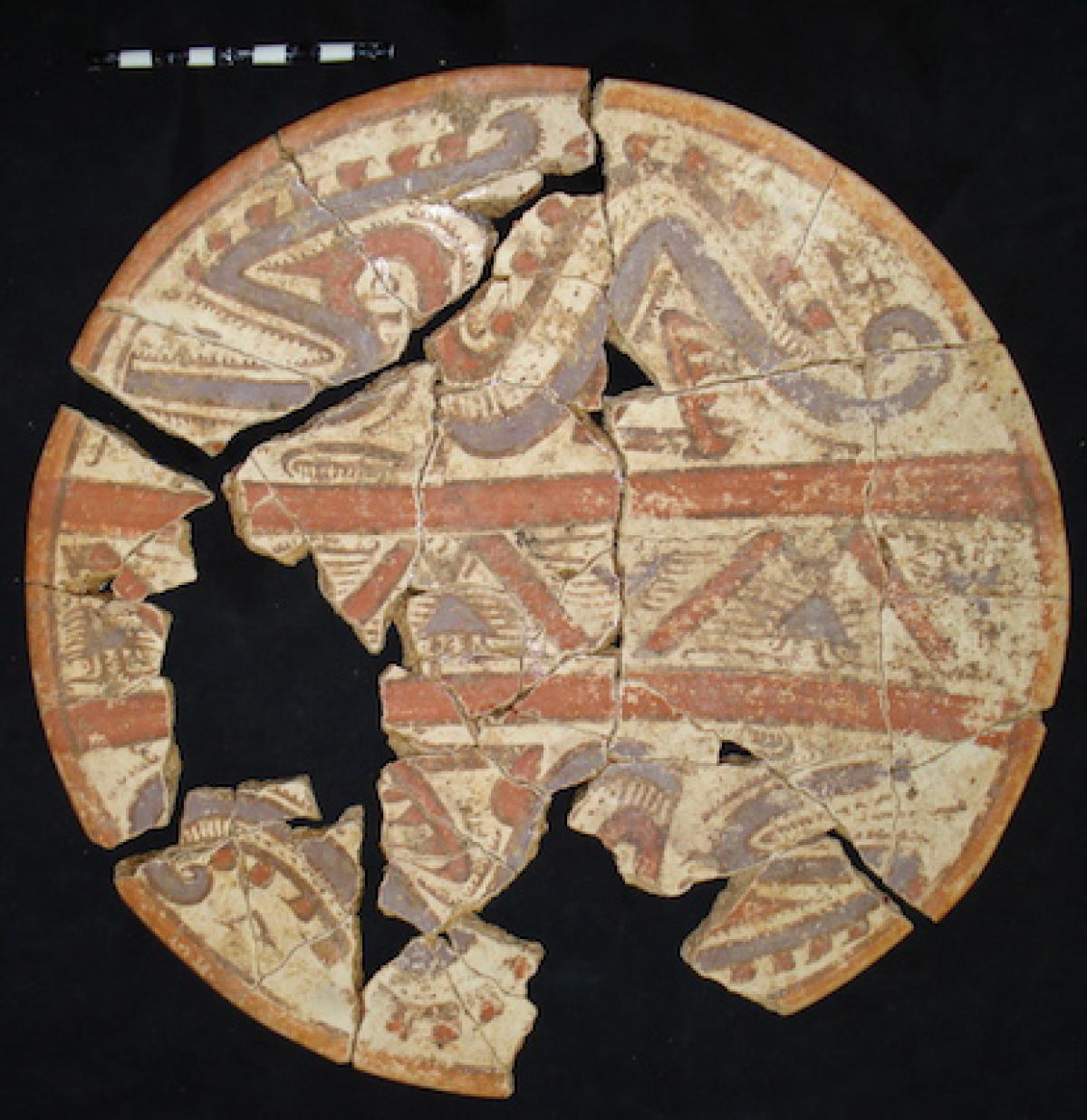 385 - Plato polícromo de borde engrosado exterior. Doble engobe (blanco en el anverso y rojo en el reverso) y decoración en bandas de color alternas zigzagueantes (rojo y morado).