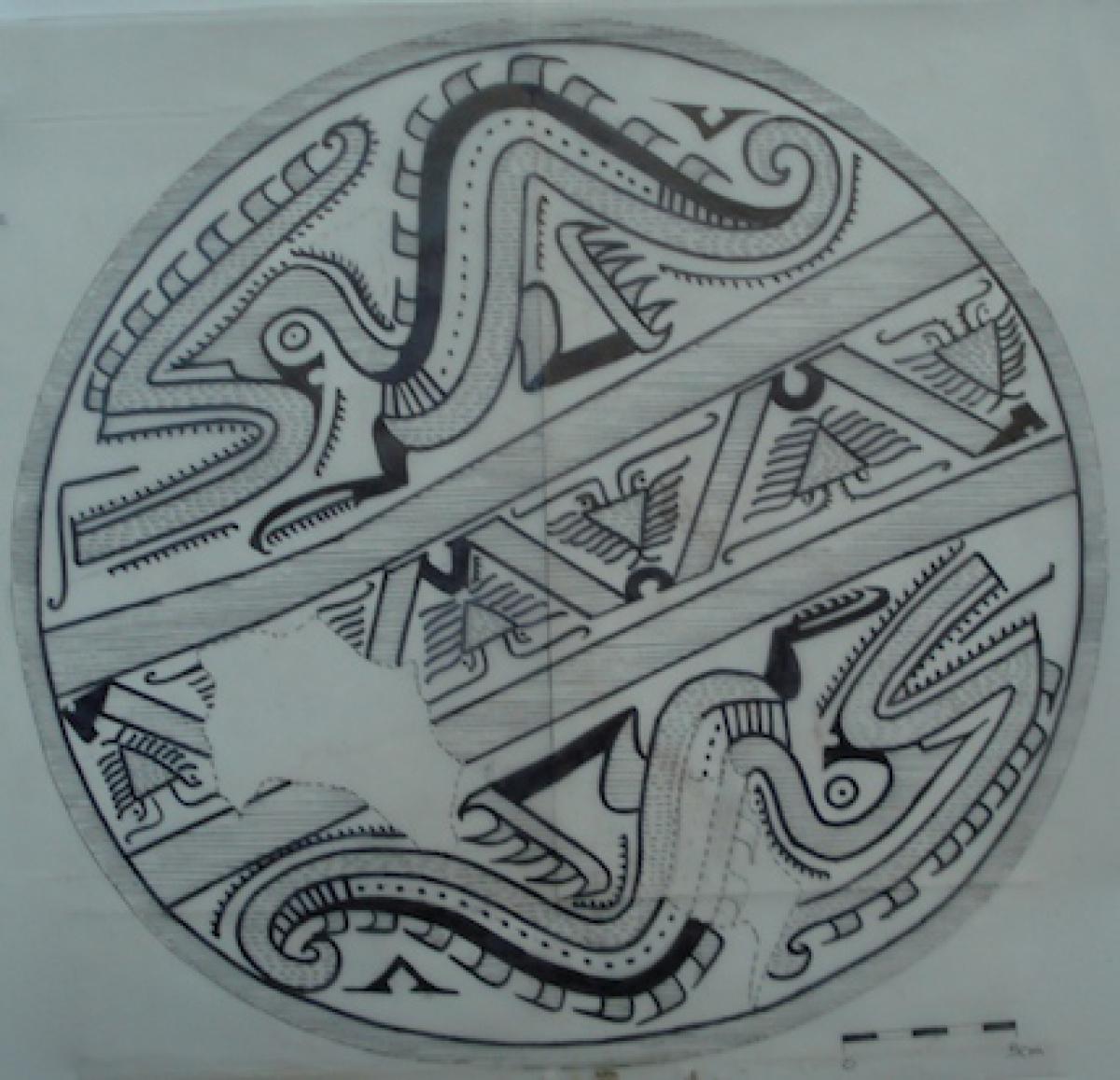 386 - Pectoral discoidal de oro martillado y repujado con la representación de un ser sobrenatural en forma de cocodrilo bicéfalo. Estilo Conte. Tiene cuatro orificios de suspensión alineados ...