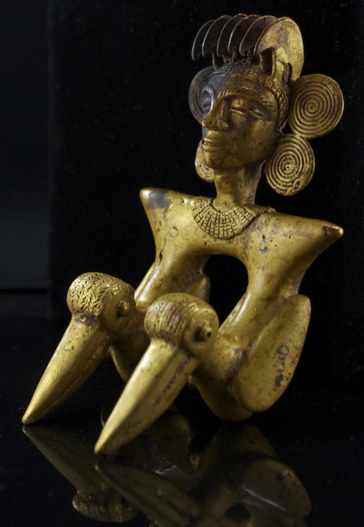 Vista de medio perfil del pendiente antropo-zoomorfo de oro fundido perteneciente al ajuar del individuo principal I07 de la tumba T2. Vemos un personaje sentado cuyo cuerpo, con la excepción de cuello y cabeza, ha sido sustituido por dos aves gemelas. 12,1x7,5x6,8 cm. Estilo Internacional.