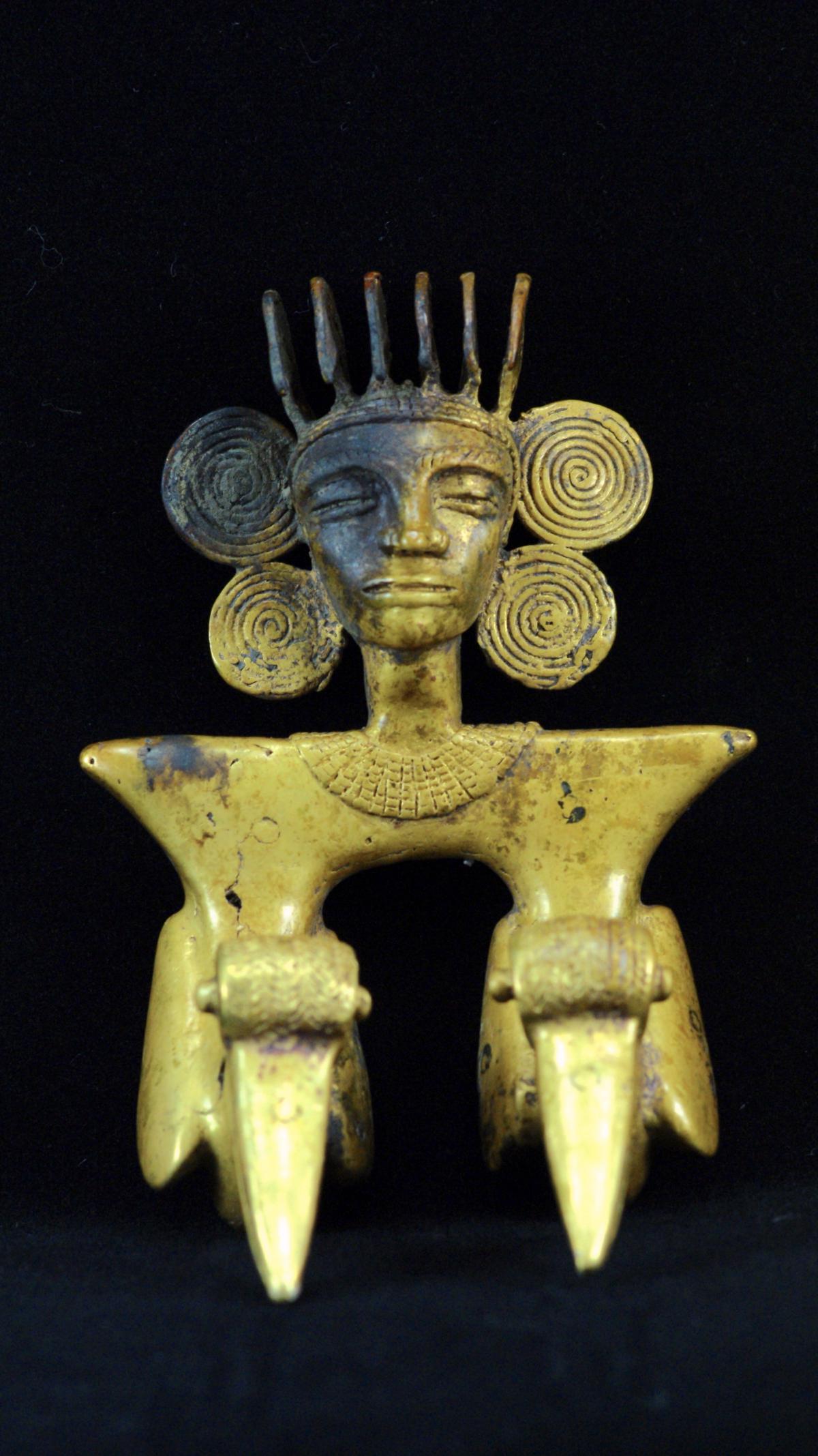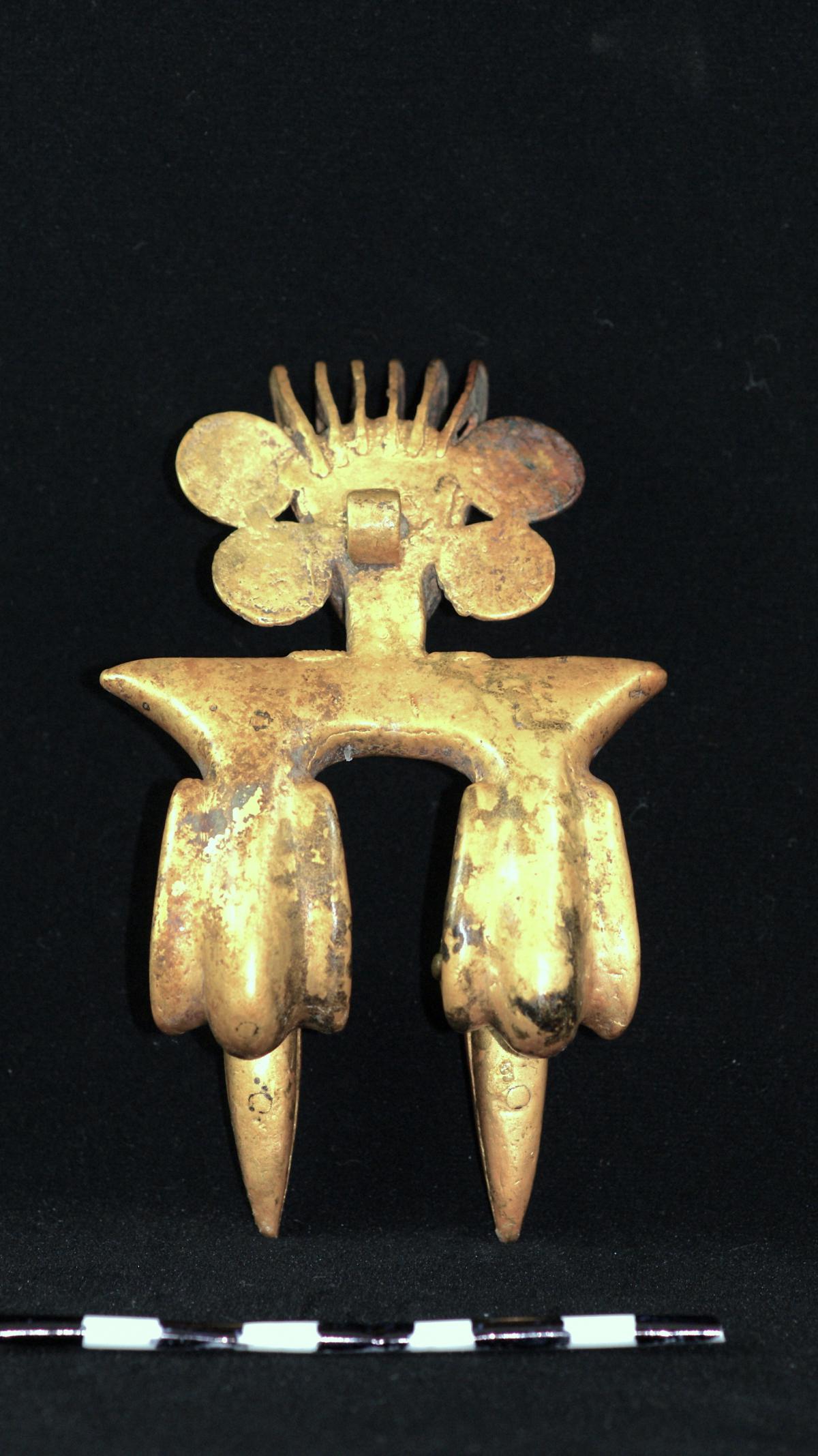 Vista frontal del pendiente figurativo de oro fundido perteneciente al ajuar del individuo principal I07 de la Tumba T2. Vemos un personaje sentado cuyo cuerpo, con la excepción de cuello y cabeza, ha sido sustituido por dos aves gemelas. 12,1x7,5x6,8 cm. Estilo Internacional.