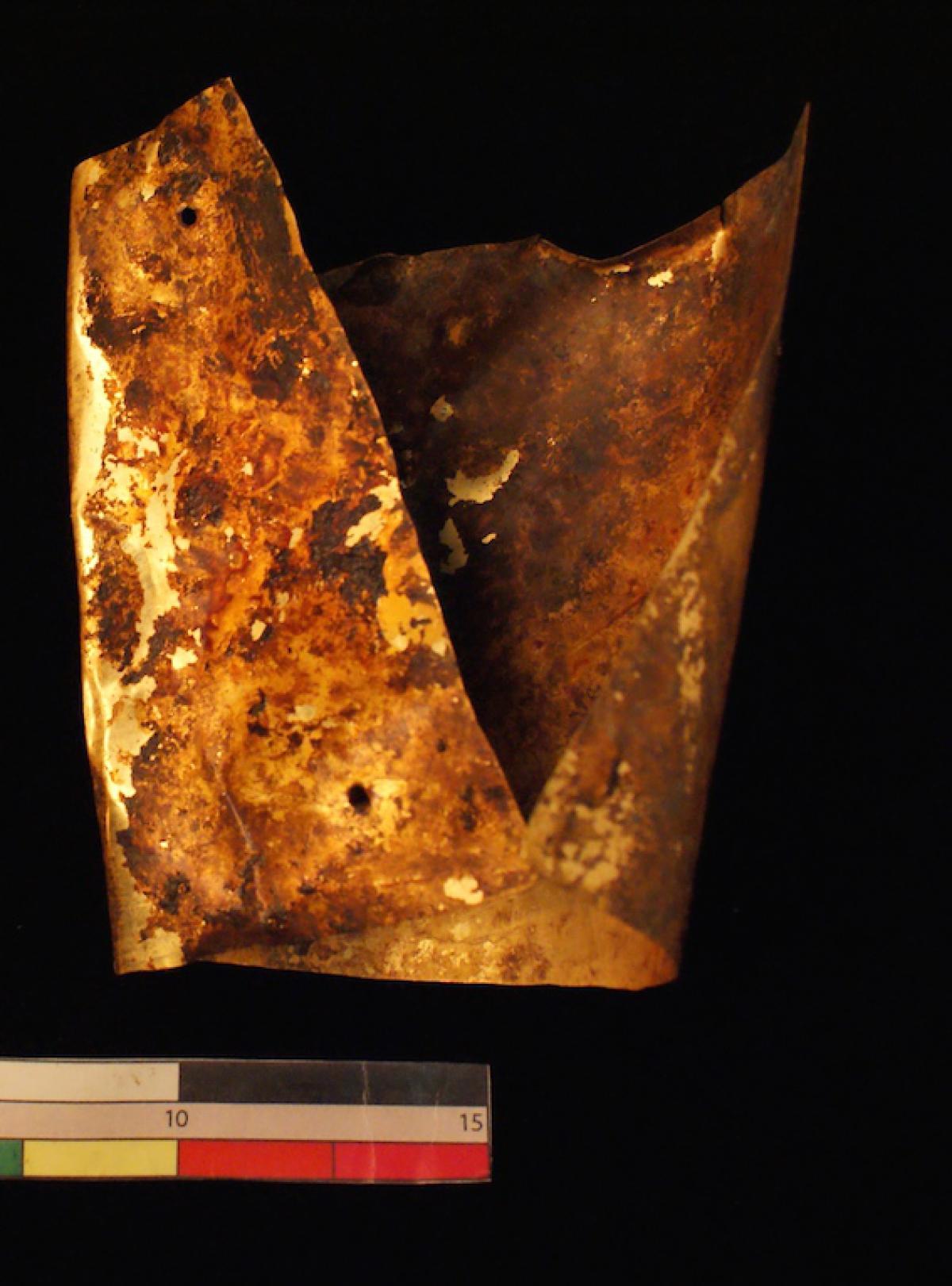 387 - Pectoral de oro martillado repujado con la representación frontal del rostro de un ser sobrenatural con rasgos de un anciano que formaba parte del ajuar del Individuo 20, un infante, de la ...