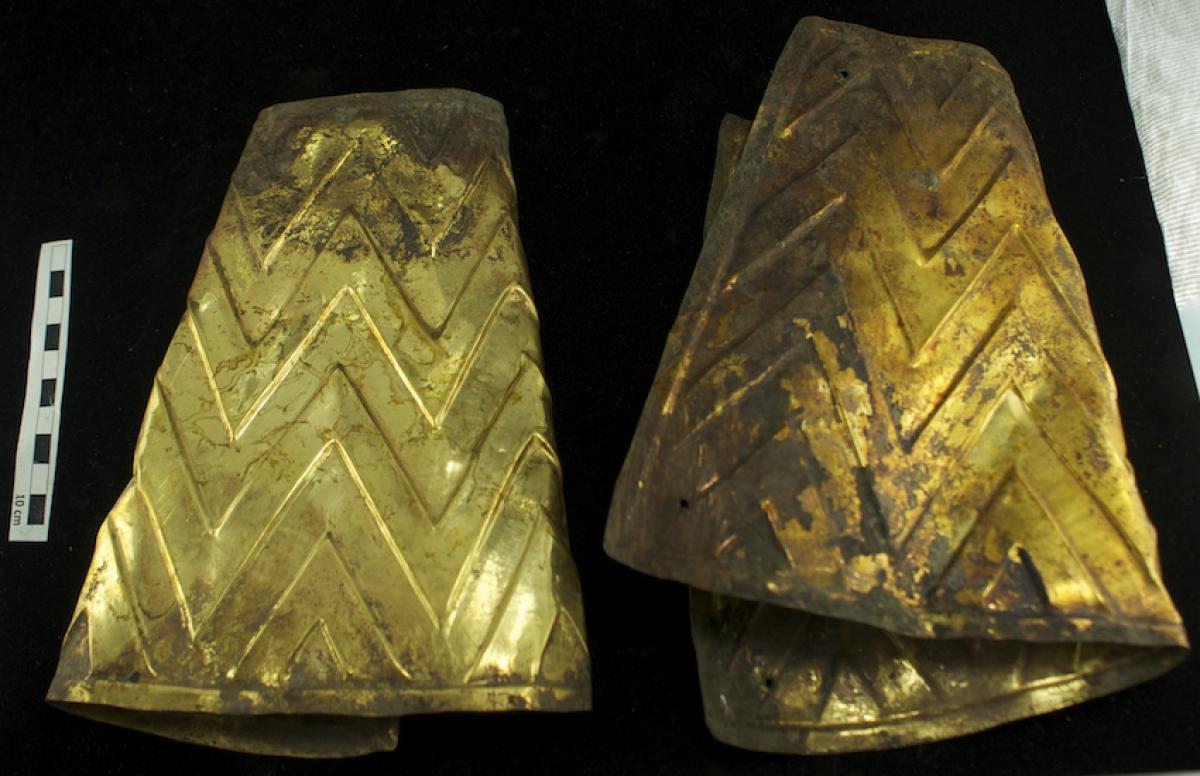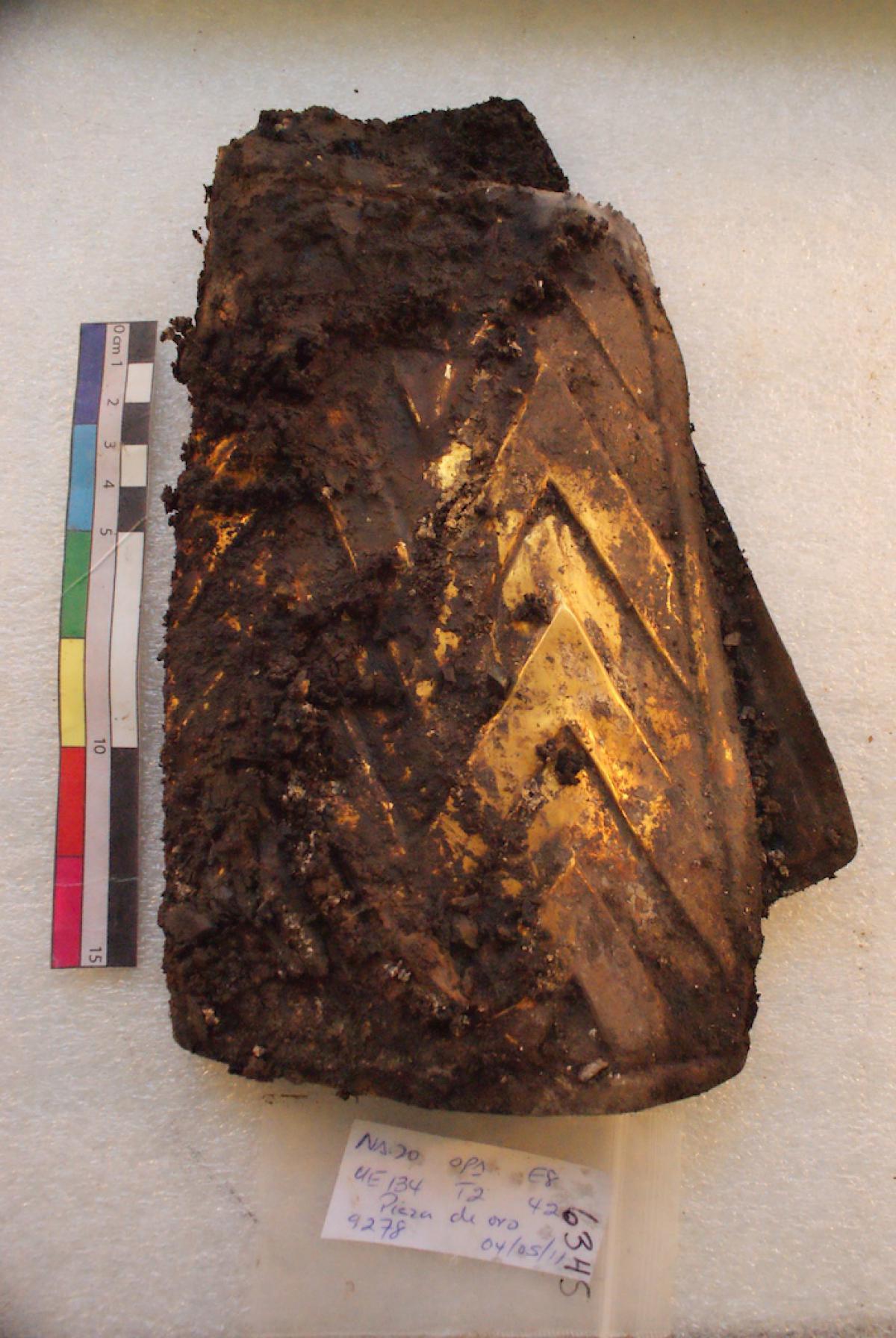 387 - Pectoral de oro martillado repujado con la representación frontal del rostro de un ser sobrenatural con rasgos de un anciano que formaba parte del ajuar del Individuo 20, un infante, de la ...