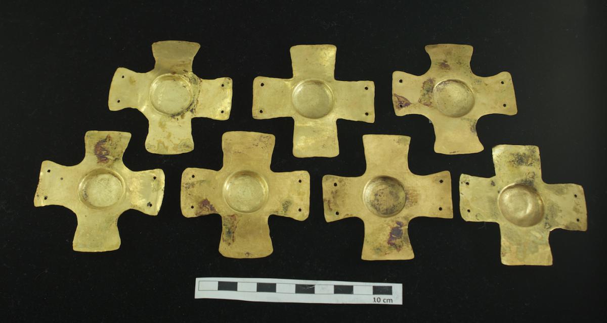 Conjunto de placas cruciformes. Estos accesorios fueron encontrados en el interior de un paquete junto con otros artefactos el cual fue colocado sobre el cuerpo del individuo I7.