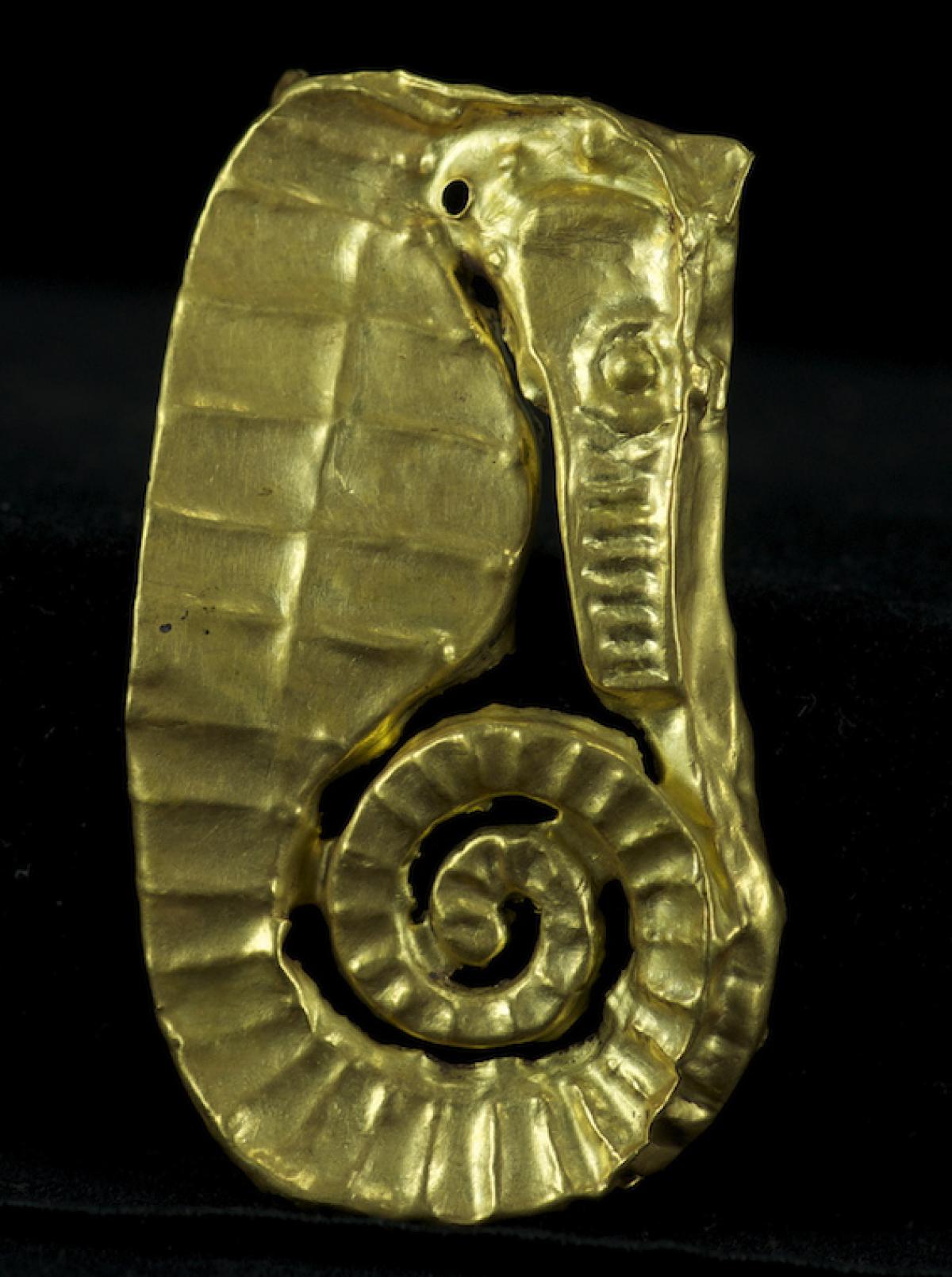 Funda de oro que recubría un pendiente de material perecedero representando un caballito de mar y que formaba parte del ajuar del individuo principal I7 de la tumba T2.