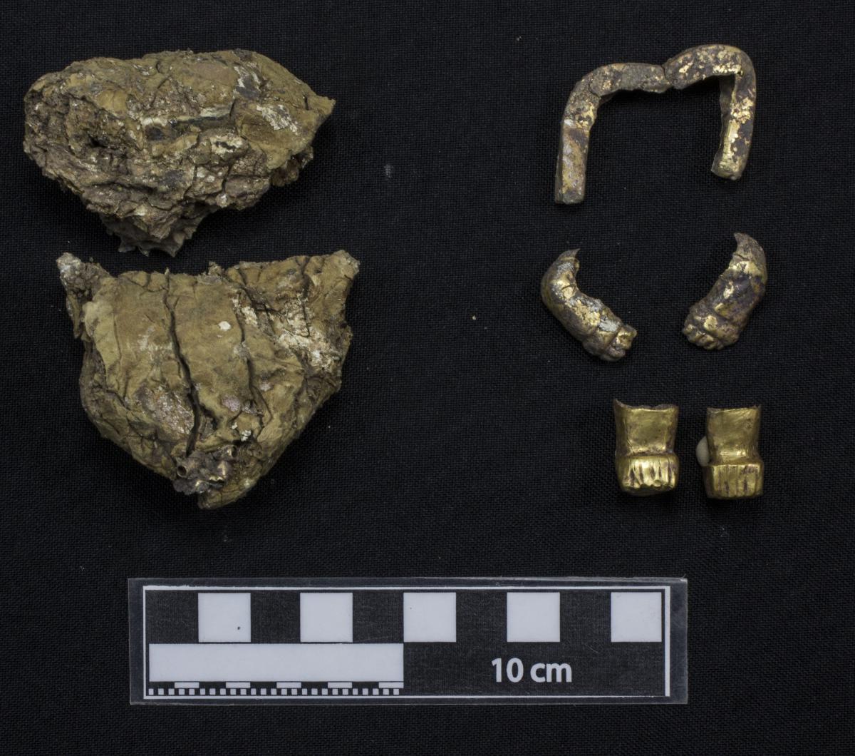 377 - Pendiente figurativo de oro fundido con la representación de un murciélago bicéfalo en vuelo que formaba parte del ajuar del individuo I5 de la tumba T2. EL aro de suspensión se localiza...
