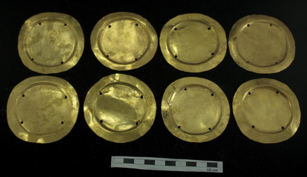 387 - Pectoral de oro martillado repujado con la representación frontal del rostro de un ser sobrenatural con rasgos de un anciano que formaba parte del ajuar del Individuo 20, un infante, de la ...