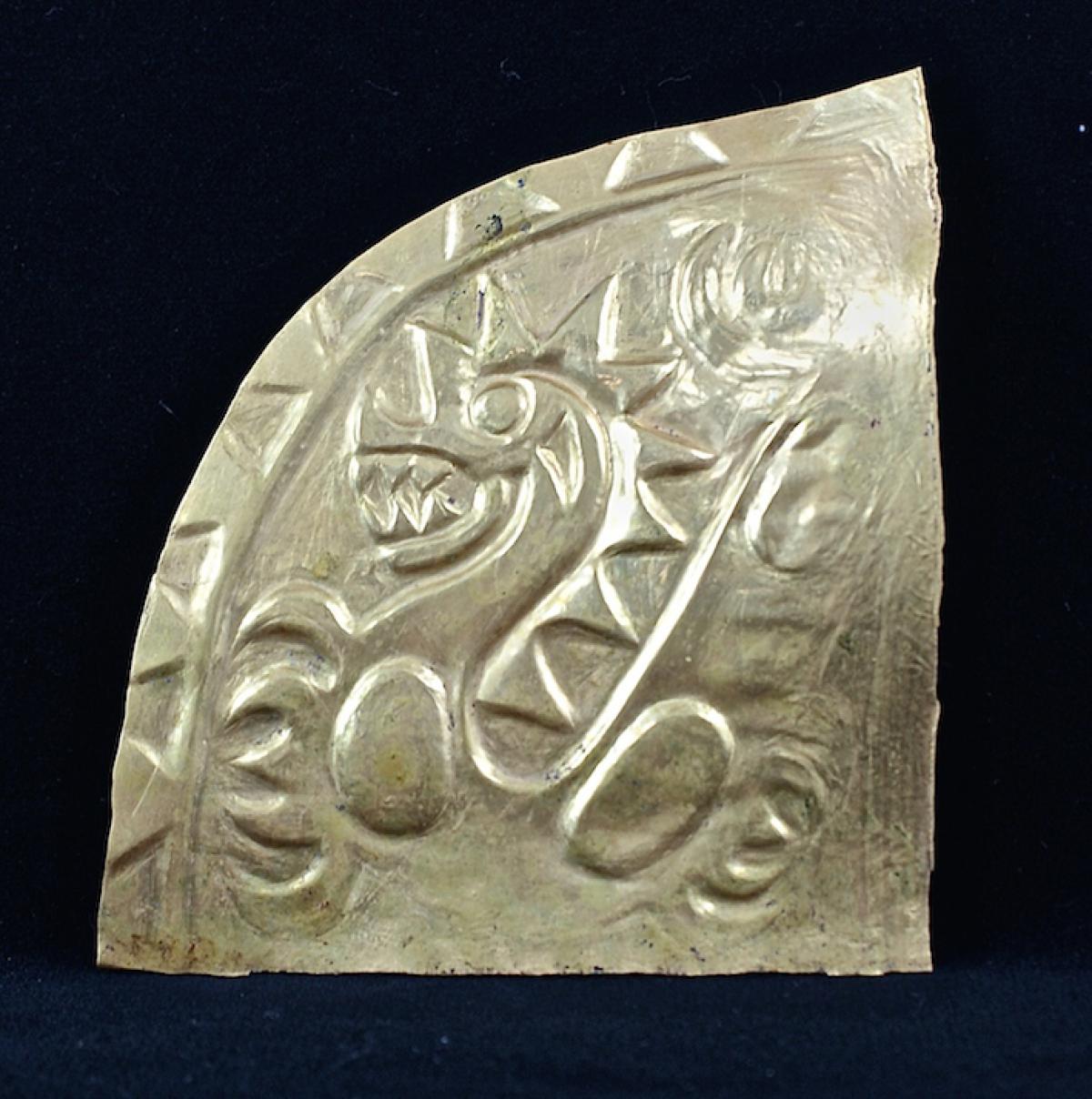 Cuadrante inferior izquierdo del pectoral 9340 con la figura de un cocodrilo mítico repujada. La foto se ha realizado girando 180º el cuadrante para que se pudiera apreciar mejor la figura.