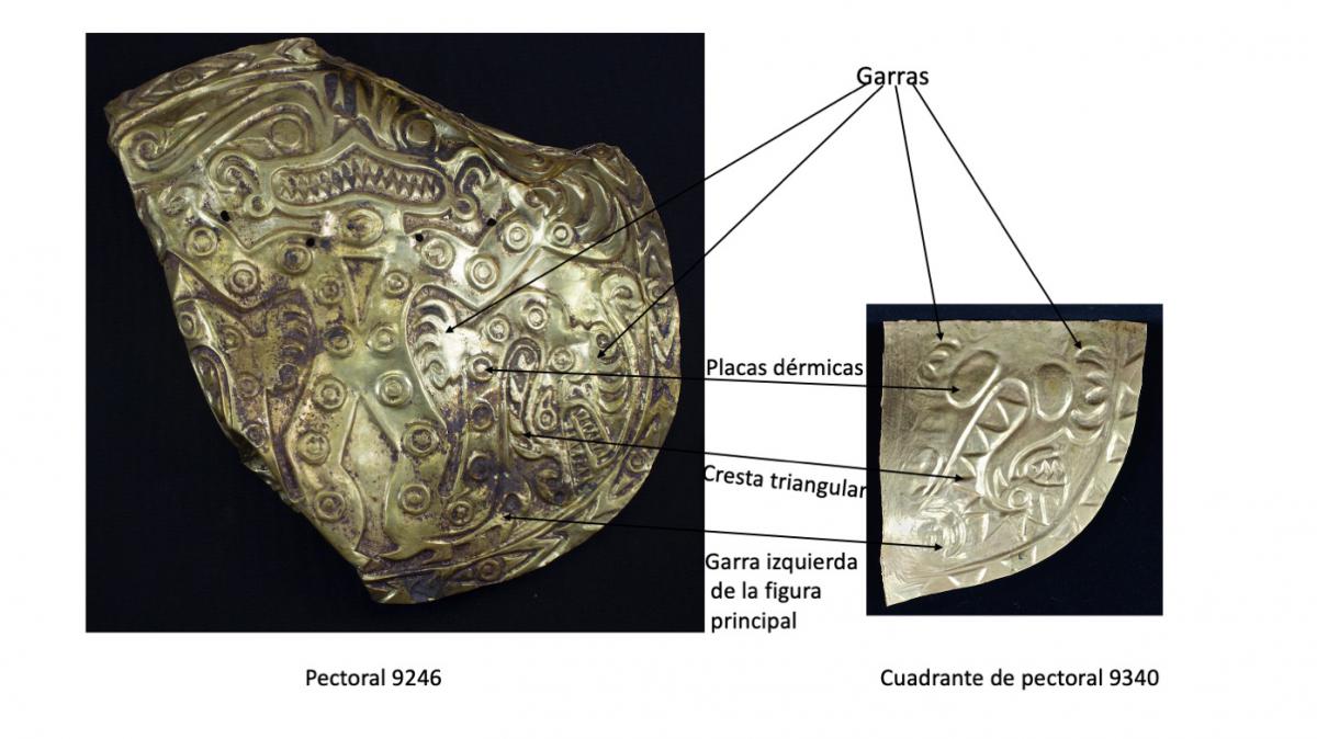 Montaje fotográfico en el que se observa el cuadrante 9340 sobre el pectoral 9246 con el fin de que se aprecie que la figura repujada en el primero debió de formar parte de una muy similar a la del segundo. Los dos pertenecen al ajuar del individuo principal de la tumba T2