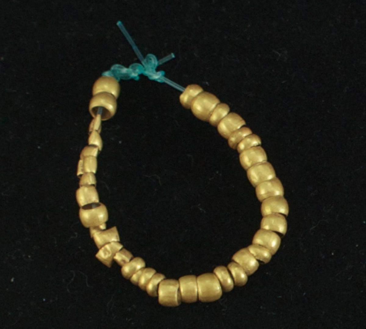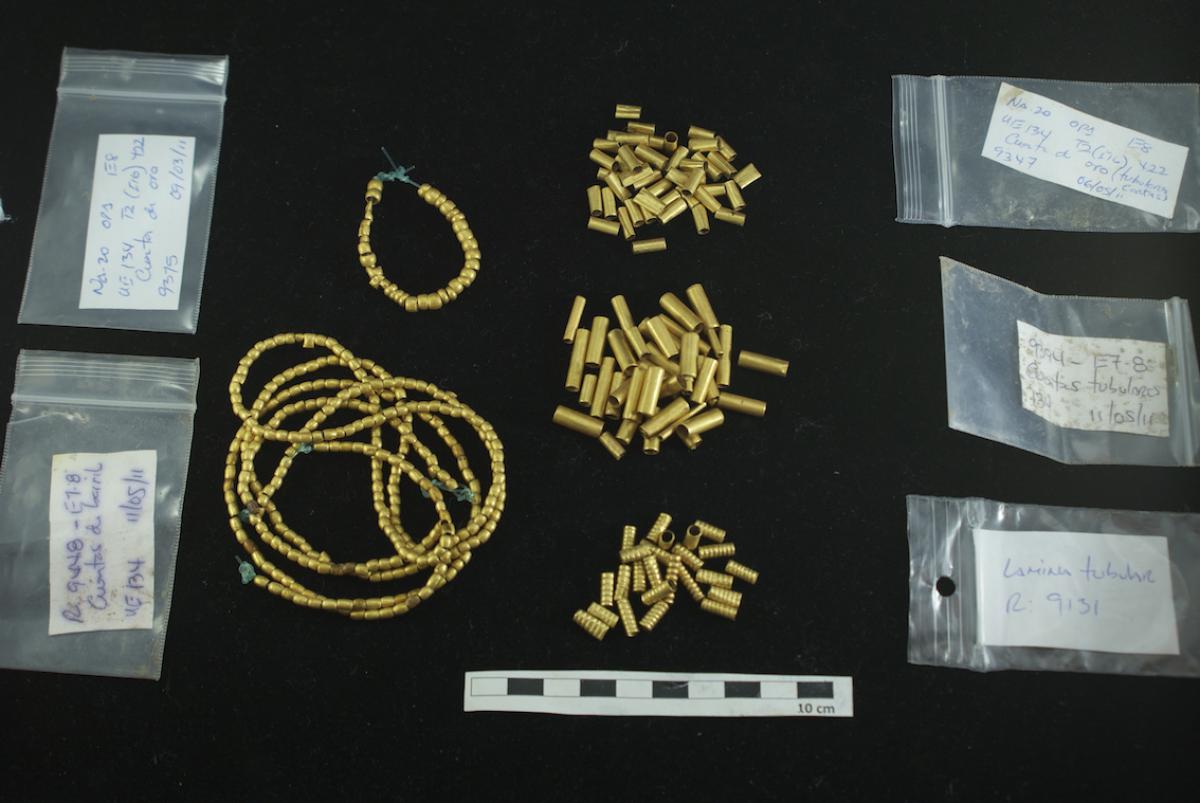Estas cuentas aparecieron junto con otras cuentas registradas con los números 9448, 9347,9394 y 9131 en el paquete de objetos suntuarios encontrado sobre el cuerpo del individuo I7.
