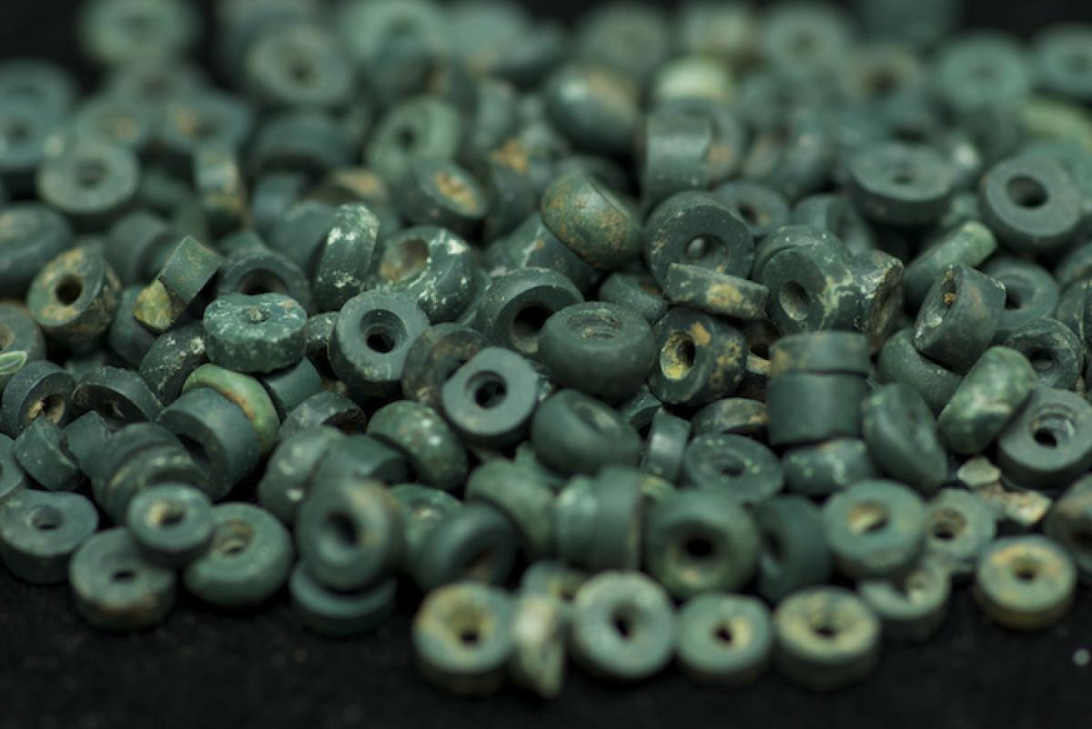 Estas cuentas de piedras verdes fueron encontradas junto con otras cuentas registradas con los números 9346, 9284, 9347, 9345, 9428, 9280.1 y 9280.2, 9343, 9399 y 9744.