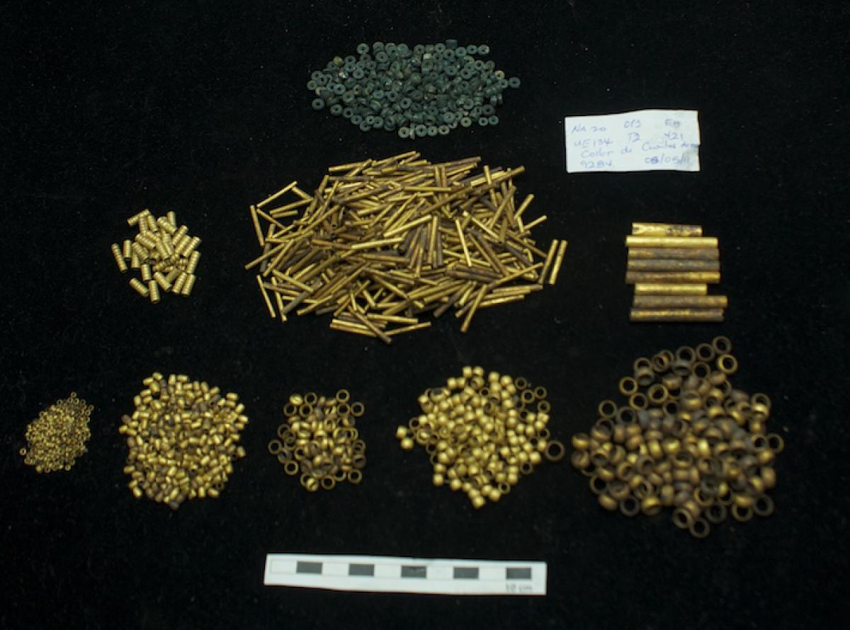 Las cuentas de piedras verdes junto con otras cuentas de oro fueron encontradas alrededor del cráneo y esplacnocráneo del individuo I7.