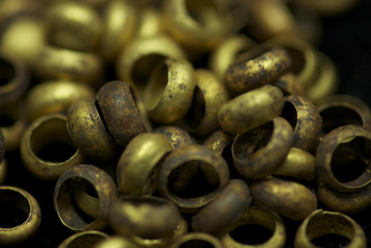 377 - Pendiente figurativo de oro fundido con la representación de un murciélago bicéfalo en vuelo que formaba parte del ajuar del individuo I5 de la tumba T2. EL aro de suspensión se localiza...