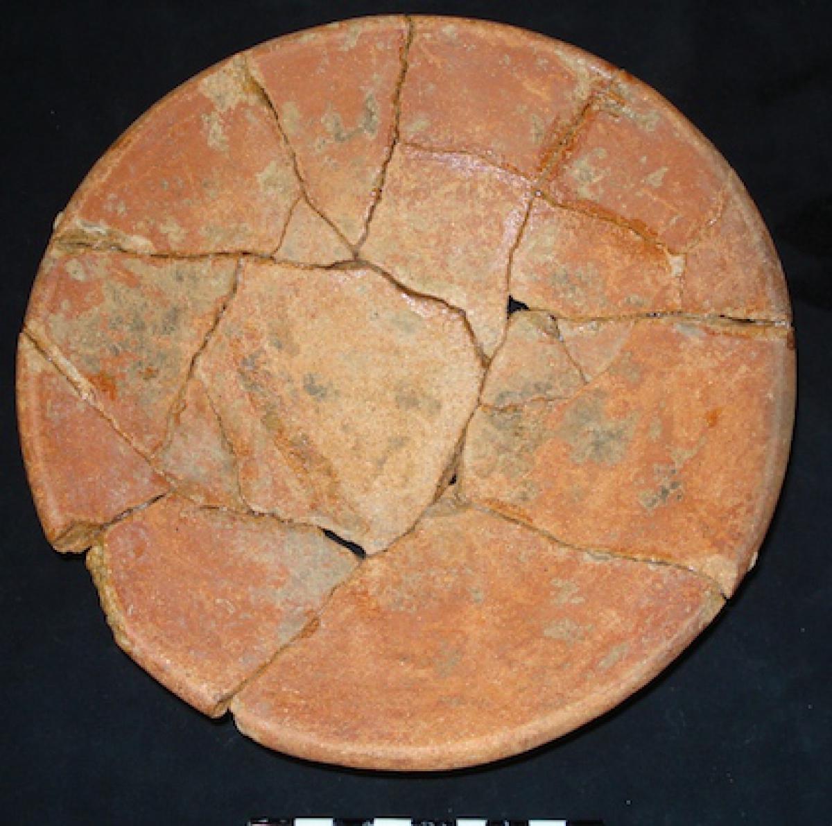 385 - Plato polícromo de borde engrosado exterior. Doble engobe (blanco en el anverso y rojo en el reverso) y decoración en bandas de color alternas zigzagueantes (rojo y morado).