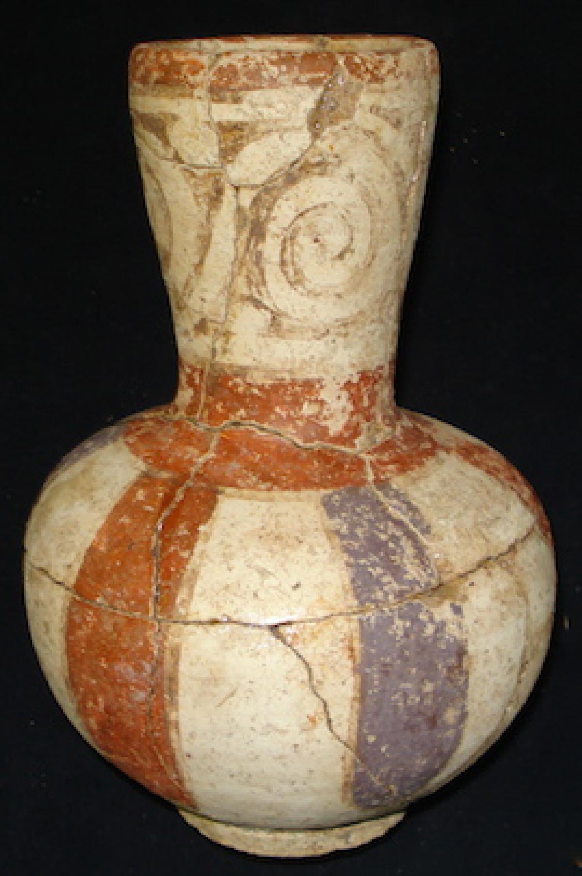 376 - Jarra polícroma carenada con hombros alzados y cuello largo. Engobe blanco y decoración de bandas de color alternas rojas y moradas.