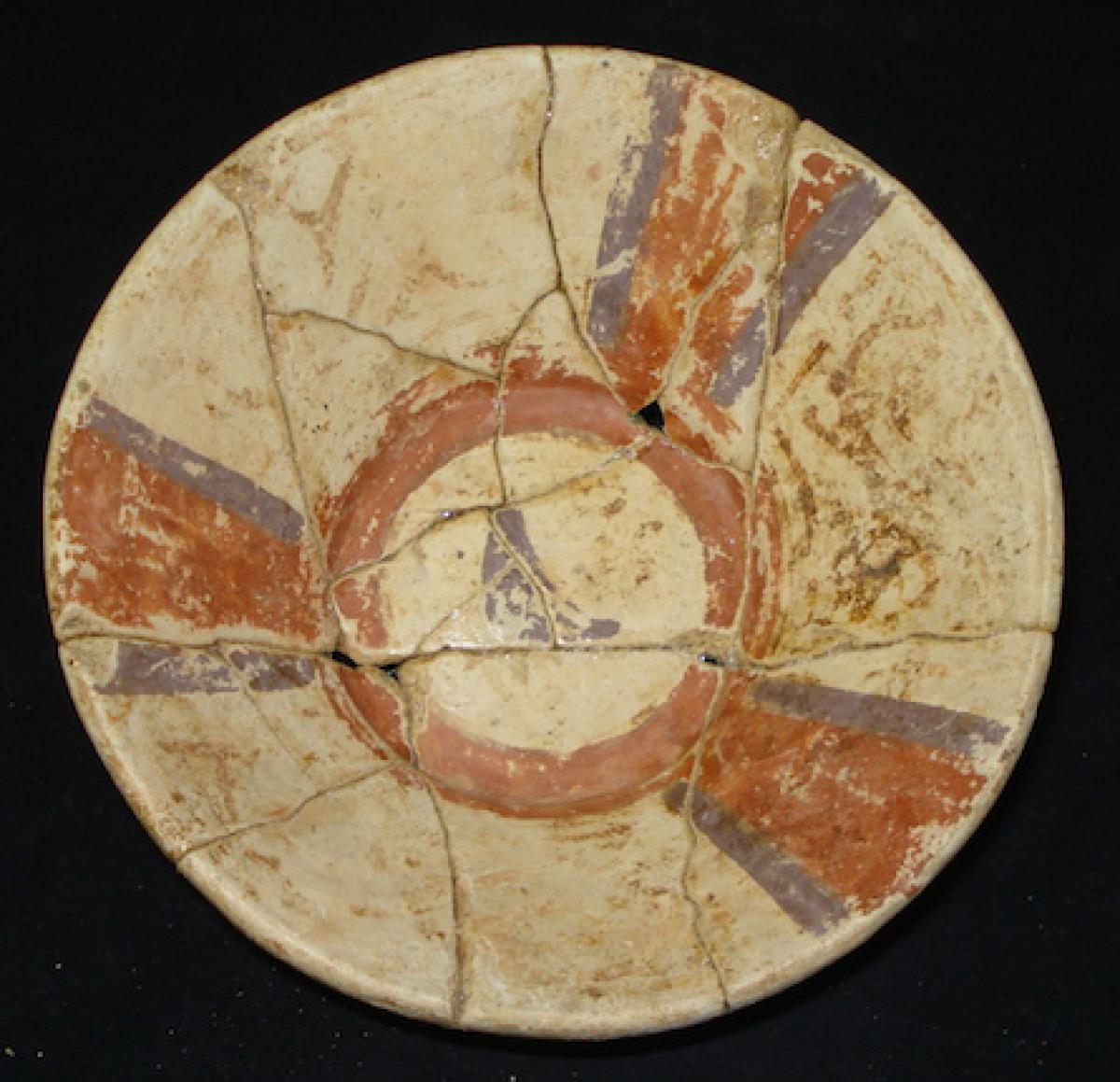 385 - Plato polícromo de borde engrosado exterior. Doble engobe (blanco en el anverso y rojo en el reverso) y decoración en bandas de color alternas zigzagueantes (rojo y morado).