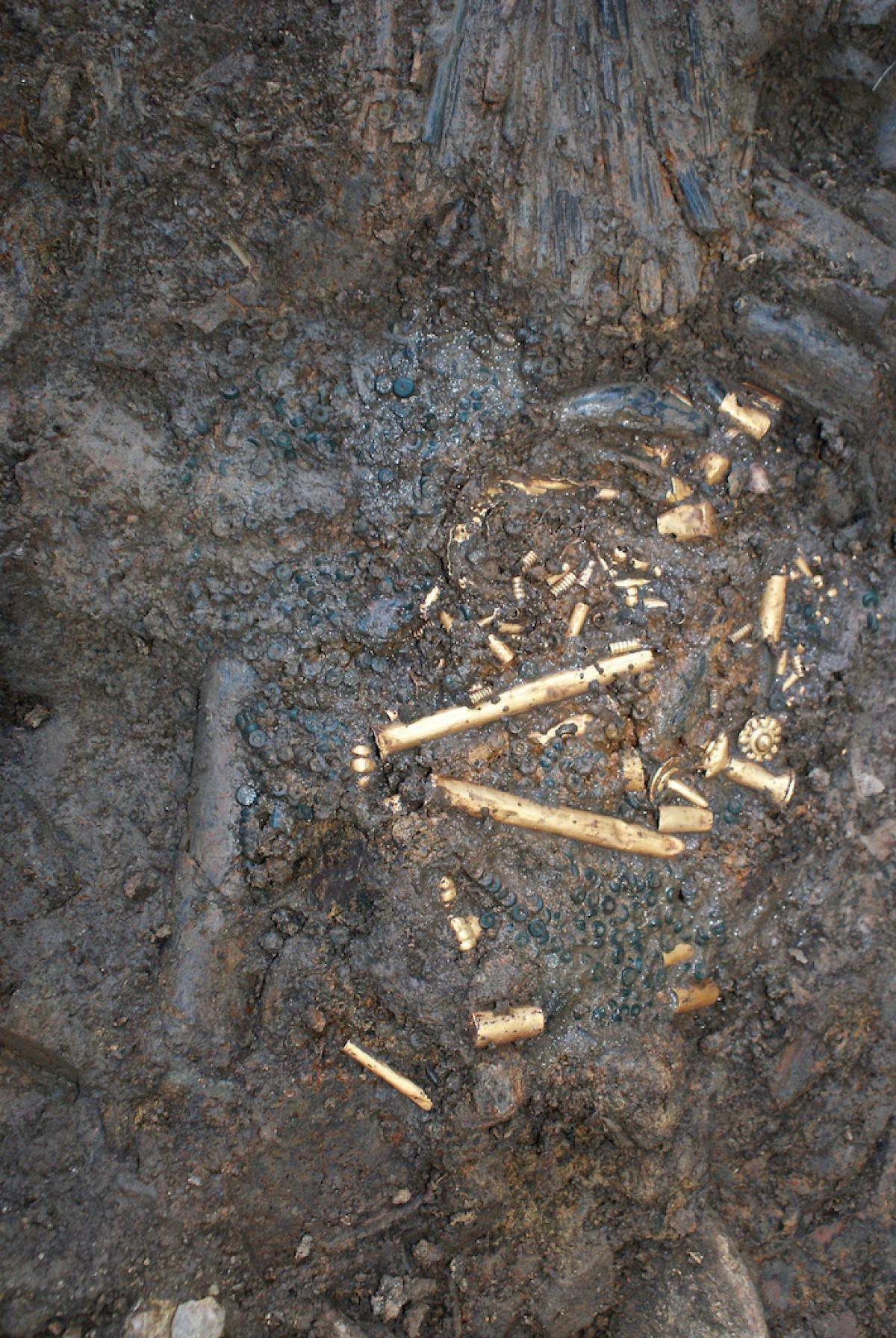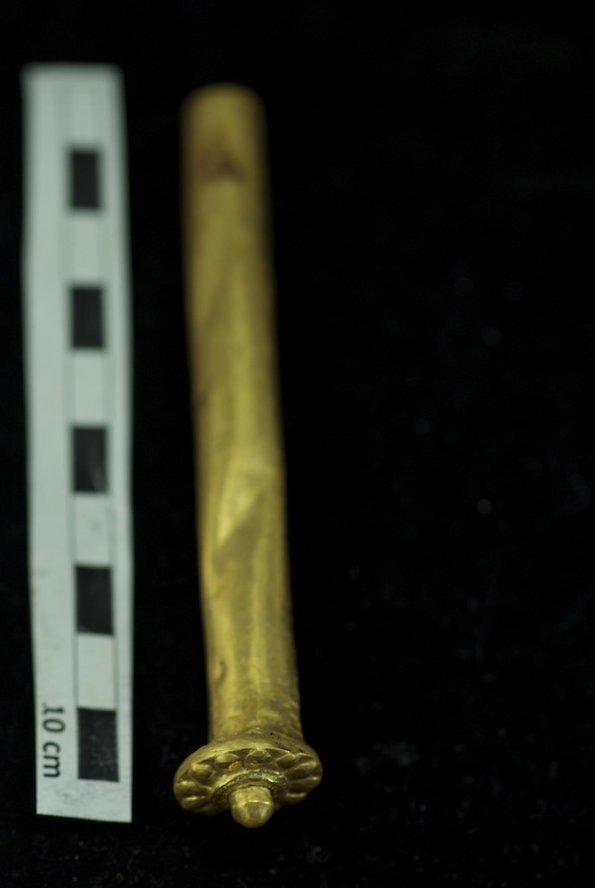 Paquete de artefactos encontrado sobre los restos del individuo I7 en la unidad UE134 de la tumba T2. En esta imagen pueden verse orejeras de cuerpo tubular de oro y las fundas de otras orejeras de madera. Sobre estos artefactos se encontraron además -no aparecen en la foto- las bases de piedra de dos espejos, un conjunto de accesorios circulares para vestimentas, un conjunto de accesorios cruciformes para vestimentas y la funda de oro de un pendiente en forma de caballito de mar.