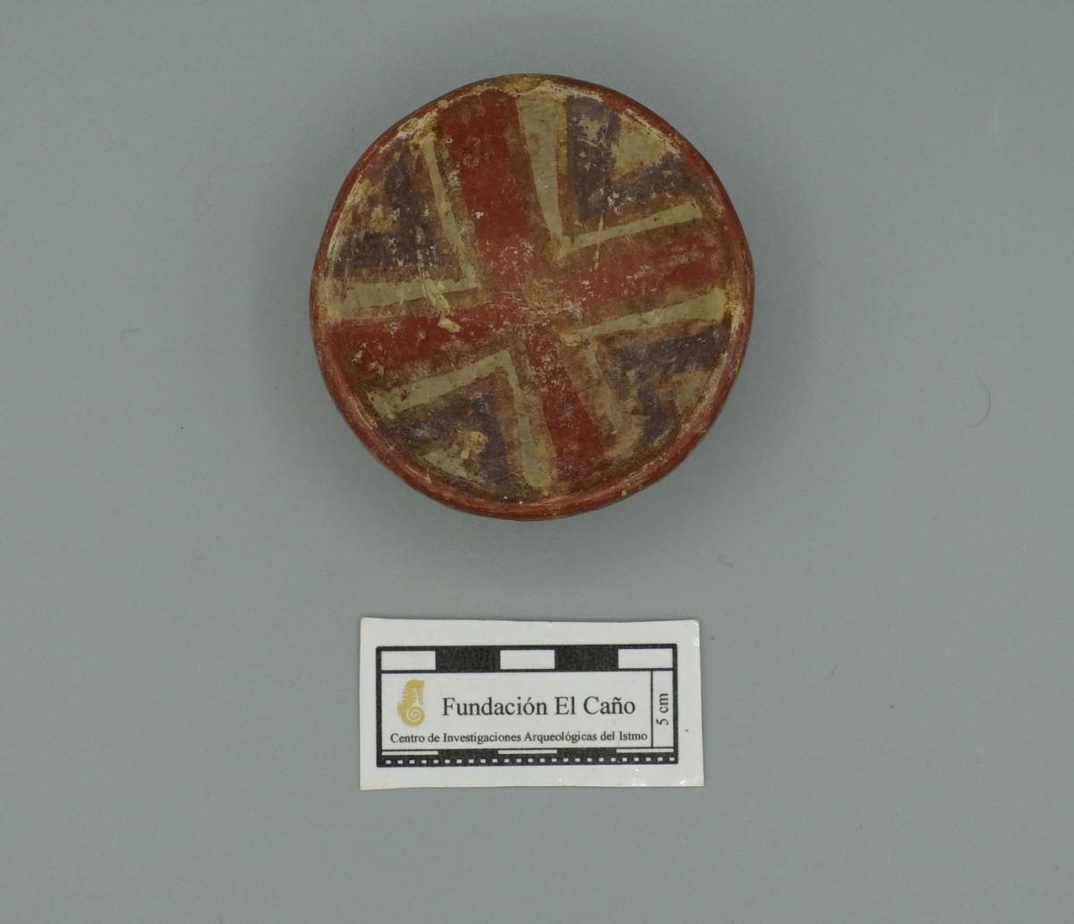 3655 - Cuenco policromo de base plana (sin soporte), con borde engrosado. Presenta engobe rojo en el exterior y blanco en el interior, con la representación de un cangrejo central y paneles geomé...