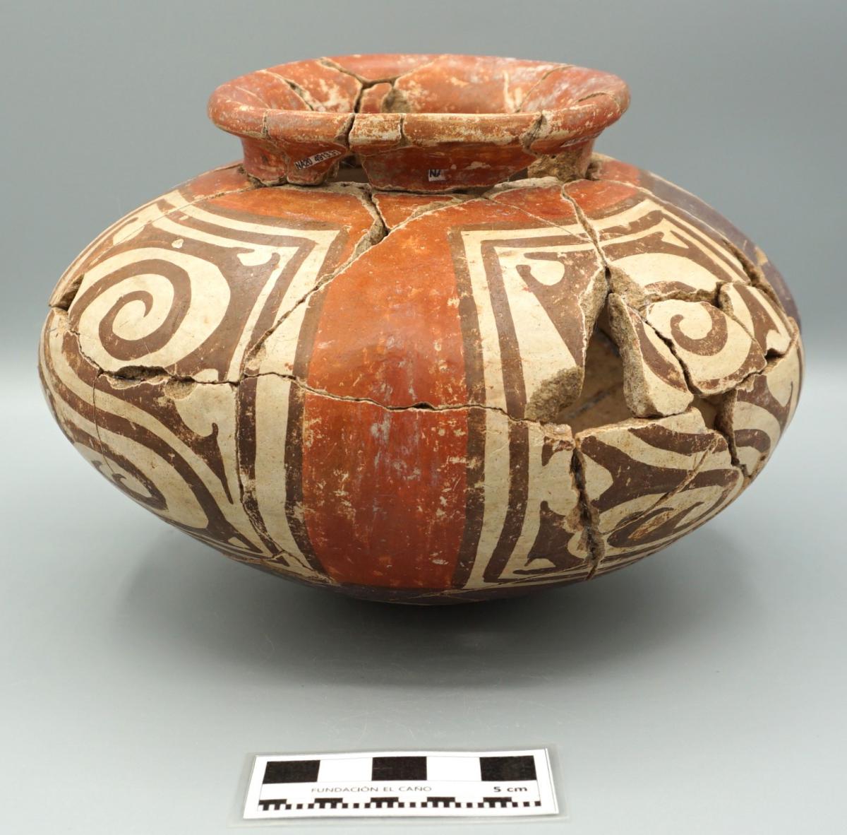 3639 - Jarra policroma globular de cuello largo. Presenta una decoración geométrica de espiral continua tipo “YC” a modo de friso en el cuello, y bandas alternas en zigzag sobre el cuerpo.