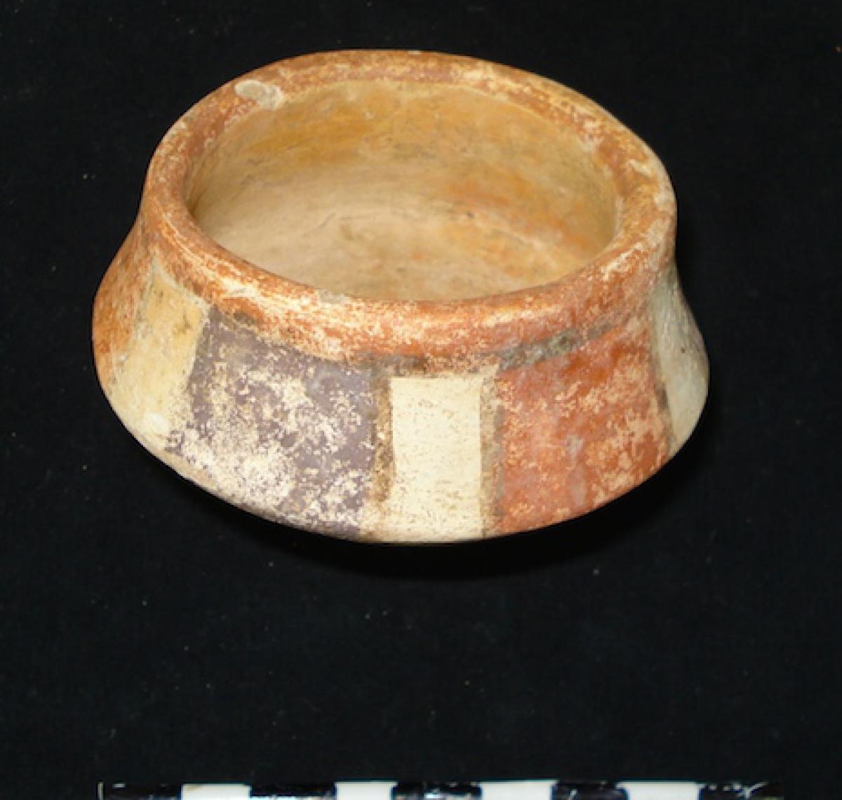 3637 - Cuenco policromo con pedestal, cuerpo de contorno cuadrado y borde engrosado. La superficie interna presenta un color crema, mientras que la externa está decorada con bandas verticales en t...