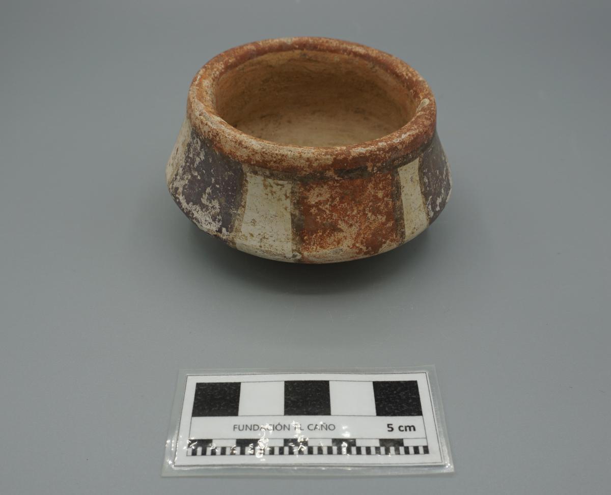 3559 - Jarra cilíndrica de cuello corto, del estilo Conte Policromo, decorada con líneas horizontales.