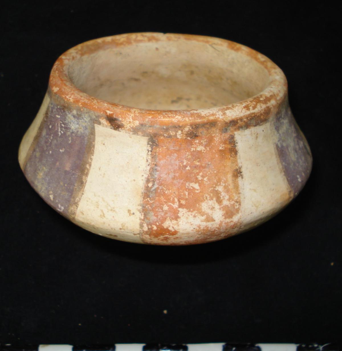 3637 - Cuenco policromo con pedestal, cuerpo de contorno cuadrado y borde engrosado. La superficie interna presenta un color crema, mientras que la externa está decorada con bandas verticales en t...