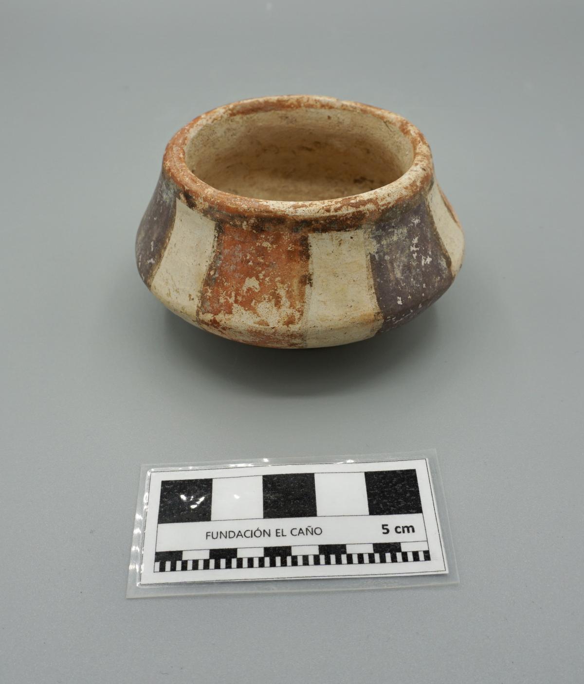 3559 - Jarra cilíndrica de cuello corto, del estilo Conte Policromo, decorada con líneas horizontales.