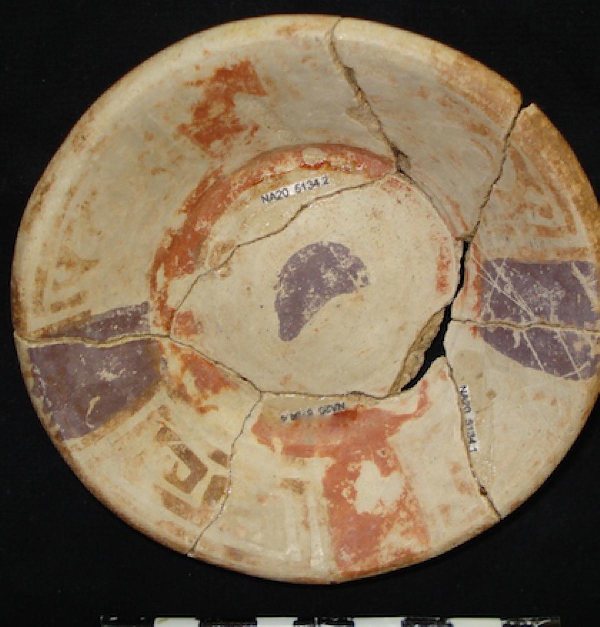 3658 - Cuenco de base plana, paredes ligeramente convexas y borde engrosado hacia el exterior, con engobe rojo externo y blanco interno, decorado con un panel central con la representación de un (...