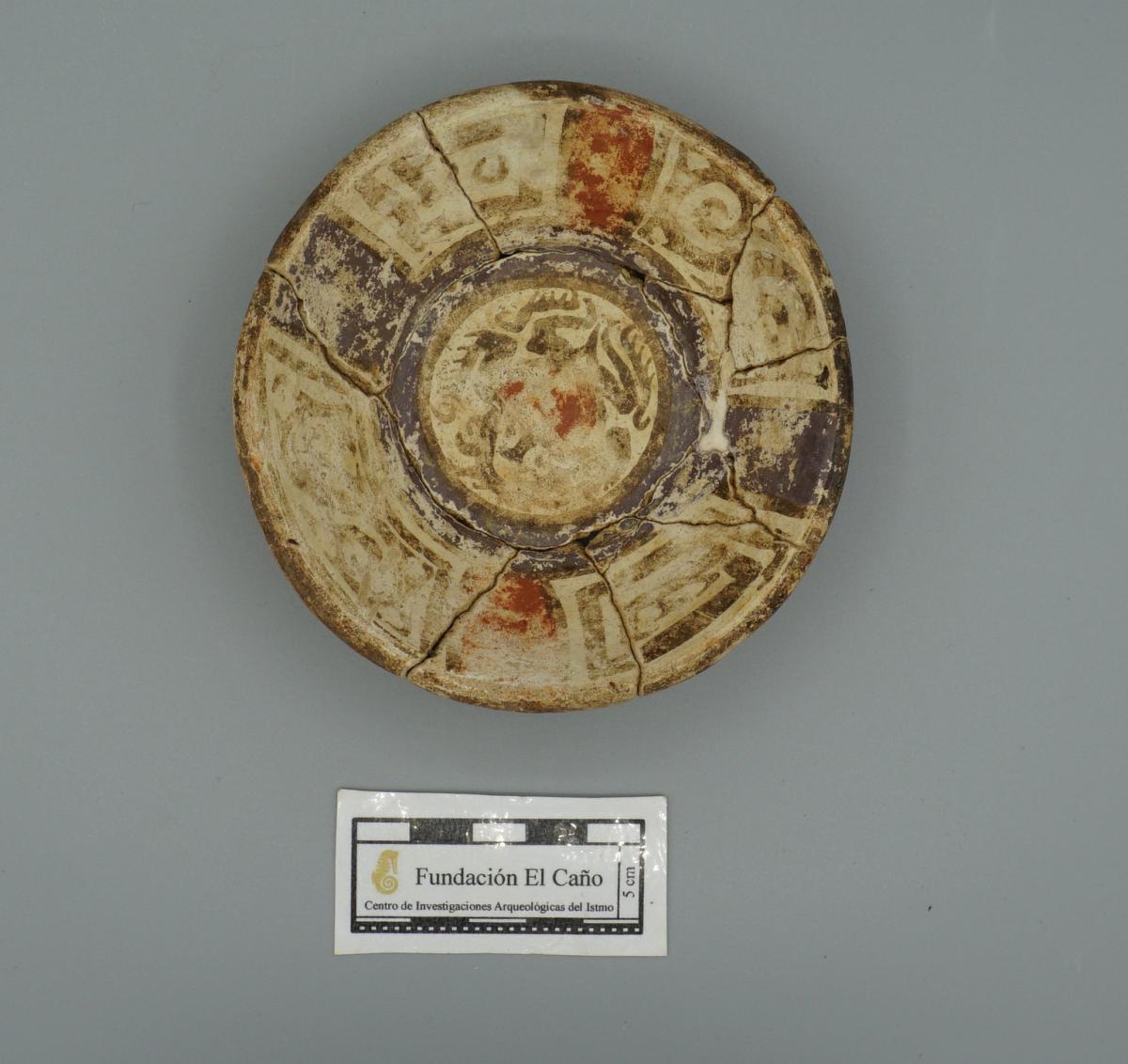 3655 - Cuenco policromo de base plana (sin soporte), con borde engrosado. Presenta engobe rojo en el exterior y blanco en el interior, con la representación de un cangrejo central y paneles geomé...