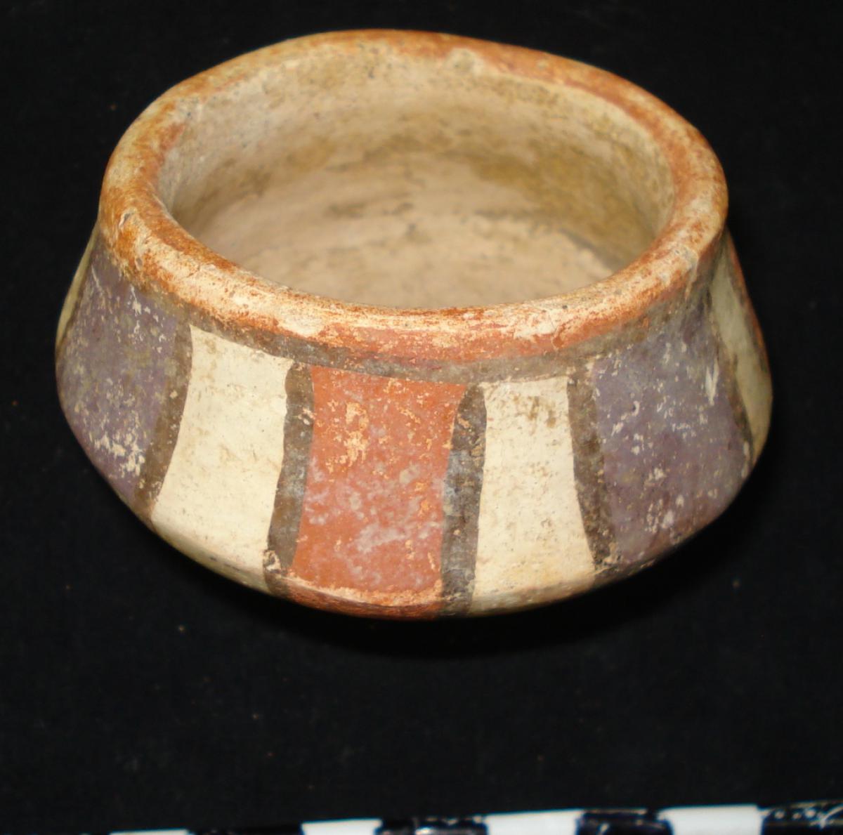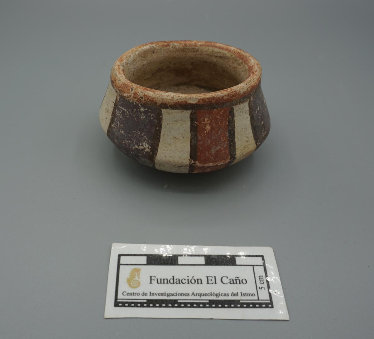 3637 - Cuenco policromo con pedestal, cuerpo de contorno cuadrado y borde engrosado. La superficie interna presenta un color crema, mientras que la externa está decorada con bandas verticales en t...