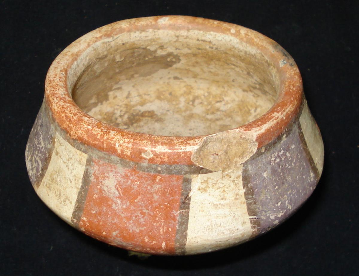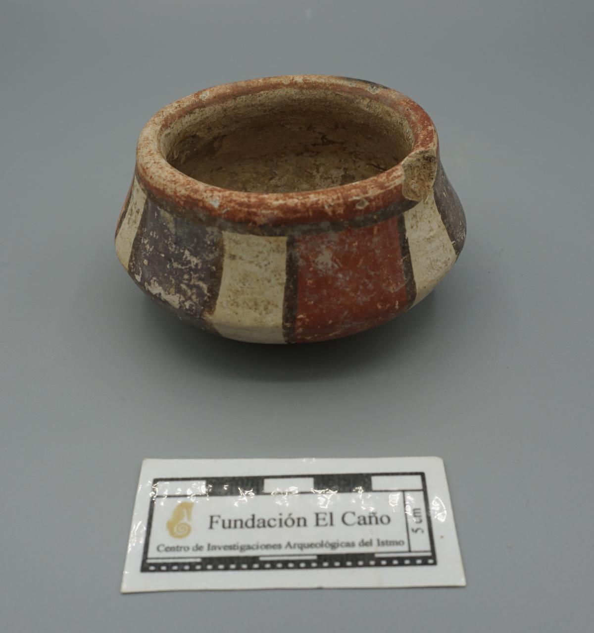 3637 - Cuenco policromo con pedestal, cuerpo de contorno cuadrado y borde engrosado. La superficie interna presenta un color crema, mientras que la externa está decorada con bandas verticales en t...
