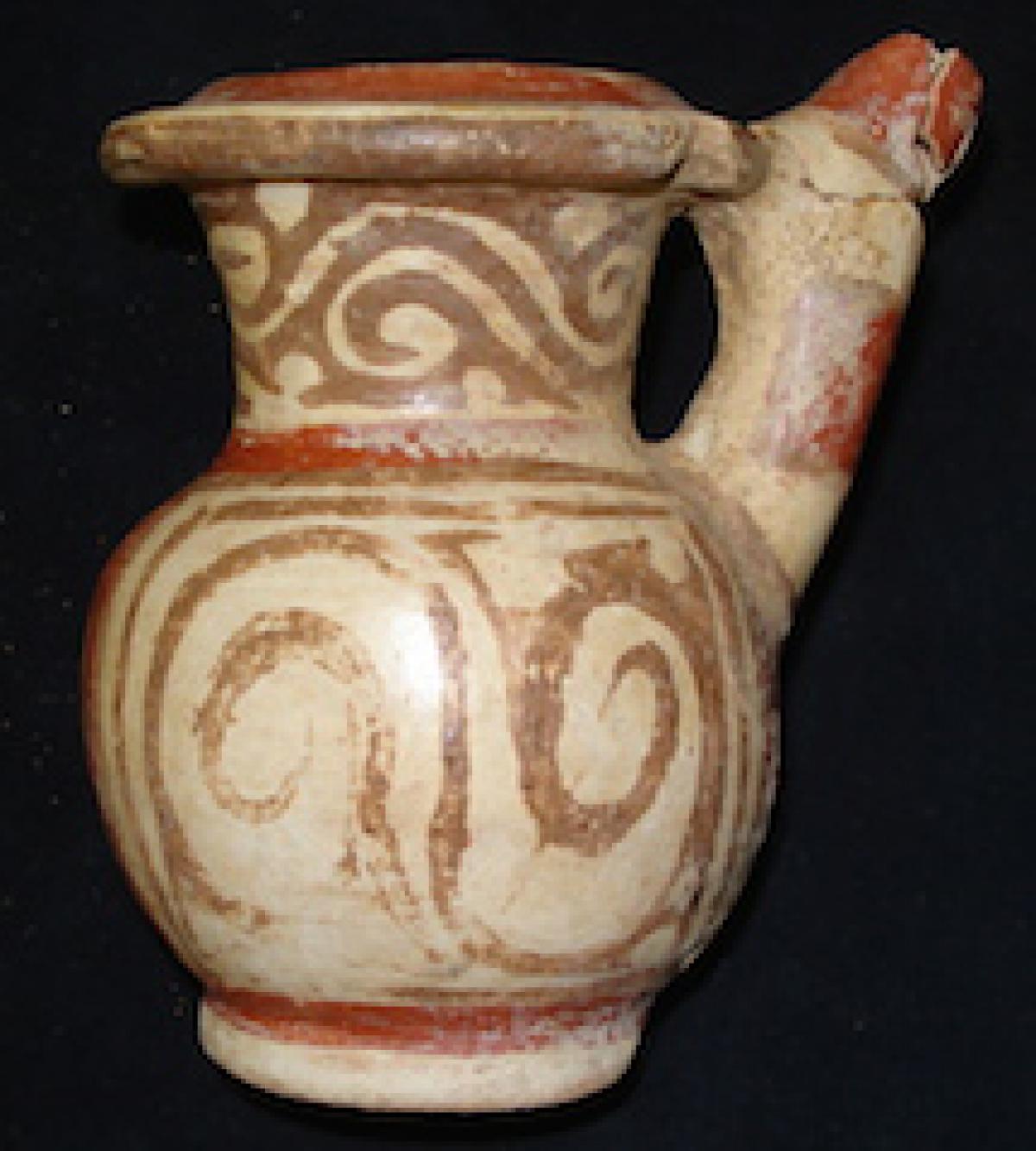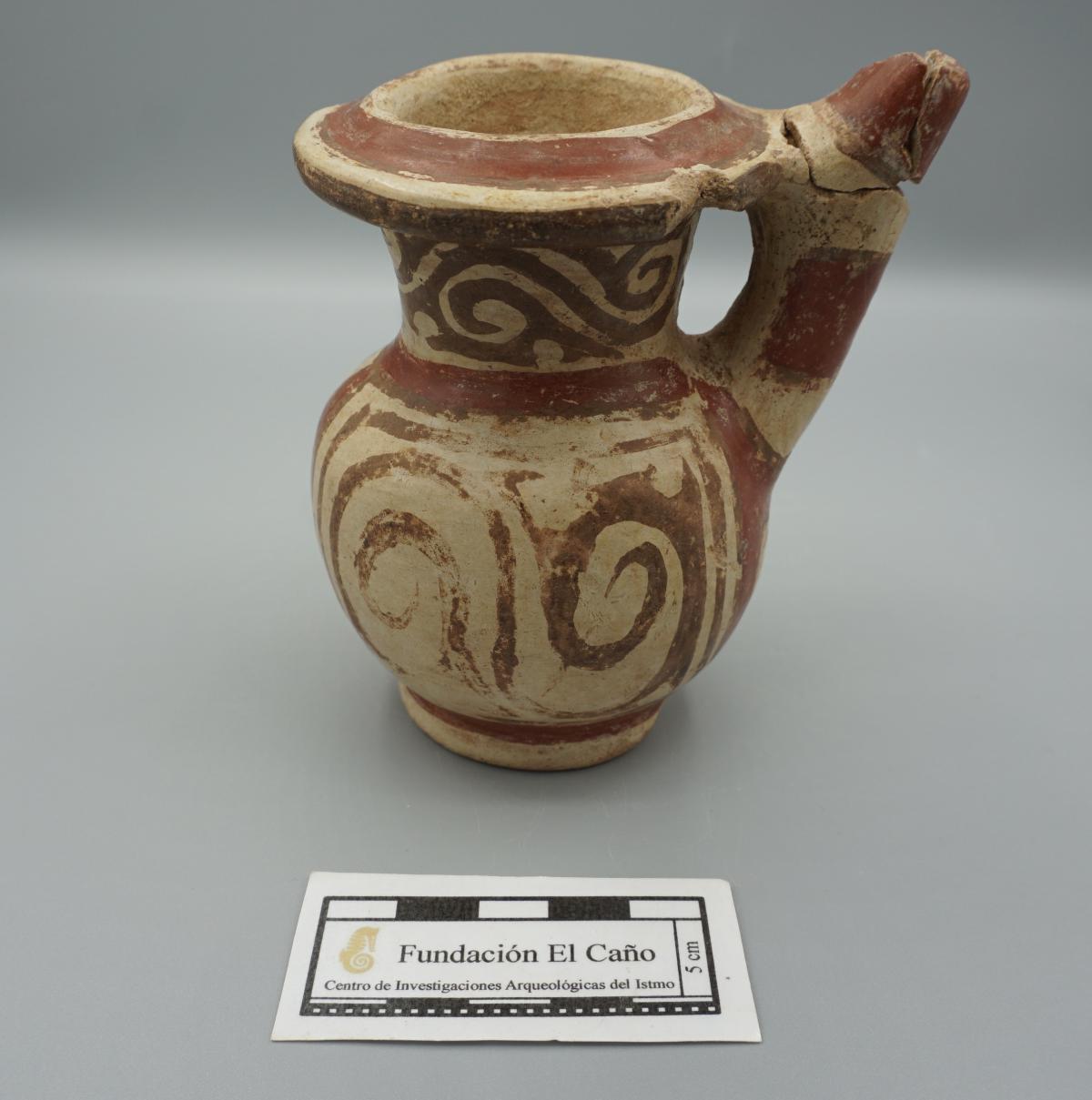 3639 - Jarra policroma globular de cuello largo. Presenta una decoración geométrica de espiral continua tipo “YC” a modo de friso en el cuello, y bandas alternas en zigzag sobre el cuerpo.