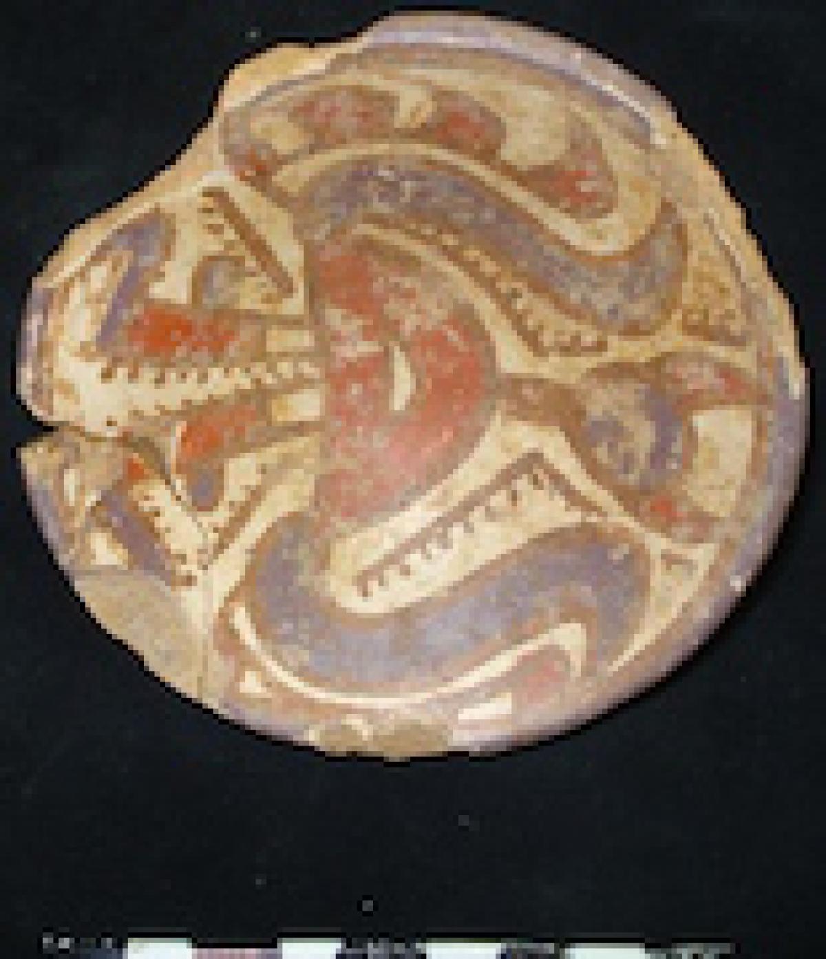 385 - Plato polícromo de borde engrosado exterior. Doble engobe (blanco en el anverso y rojo en el reverso) y decoración en bandas de color alternas zigzagueantes (rojo y morado).