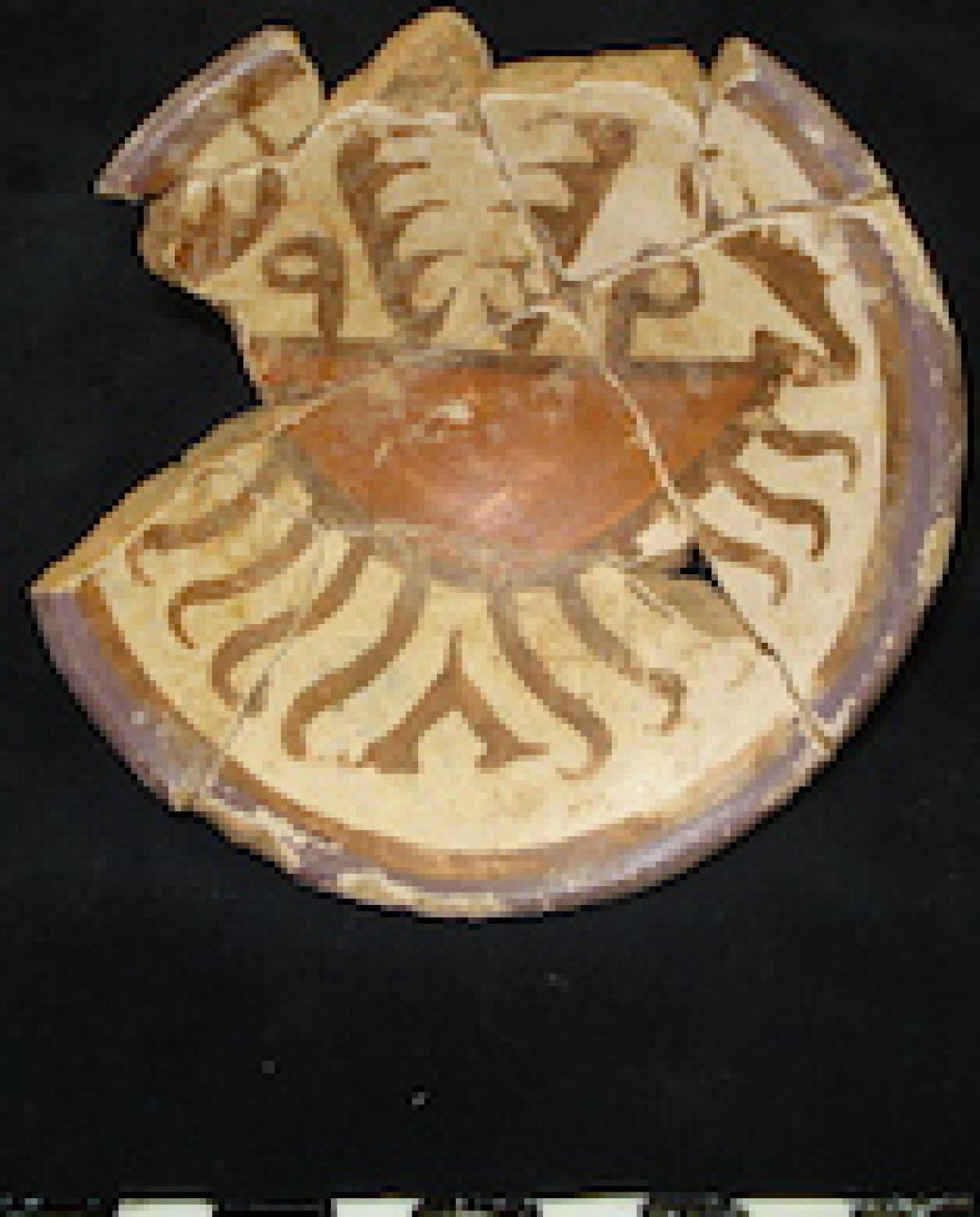 3658 - Cuenco de base plana, paredes ligeramente convexas y borde engrosado hacia el exterior, con engobe rojo externo y blanco interno, decorado con un panel central con la representación de un (...