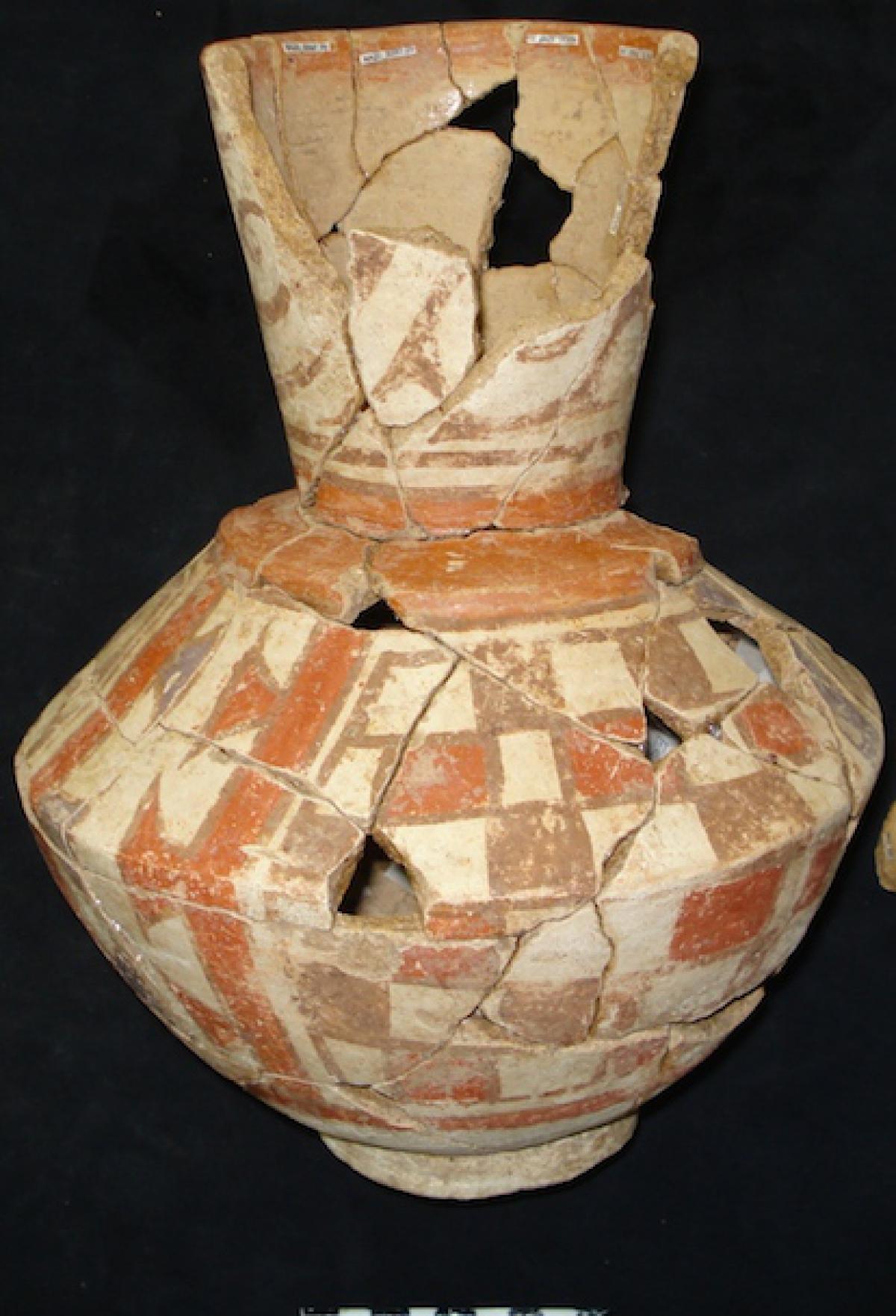 376 - Jarra polícroma carenada con hombros alzados y cuello largo. Engobe blanco y decoración de bandas de color alternas rojas y moradas.
