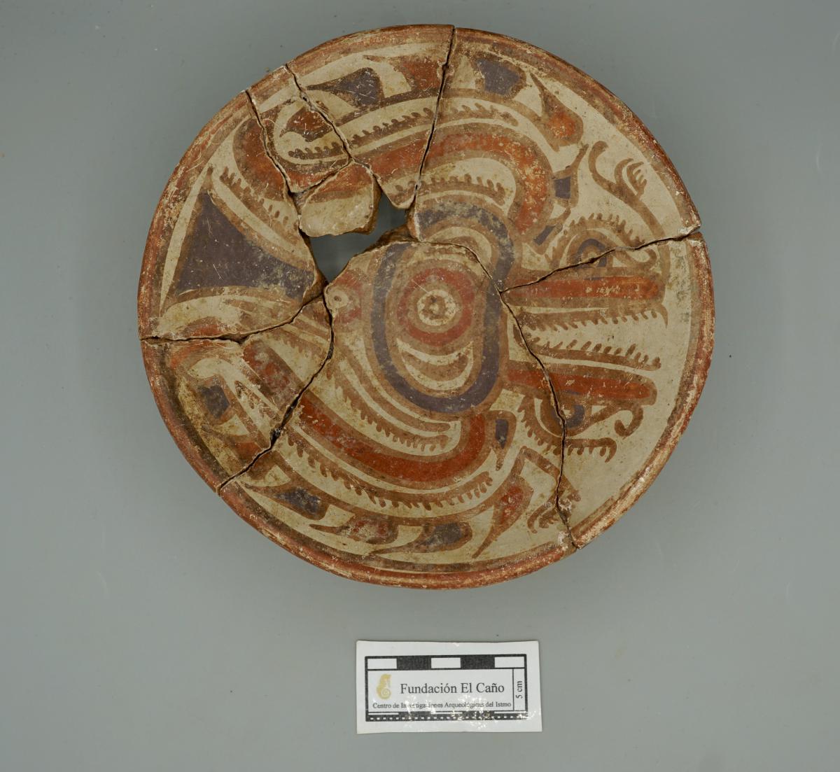Cuenco semiesférico de base anular y borde redondeado. Exterior sin engobe y engobe blanco en el interior. Motivo zoomorfo representando a un ave.