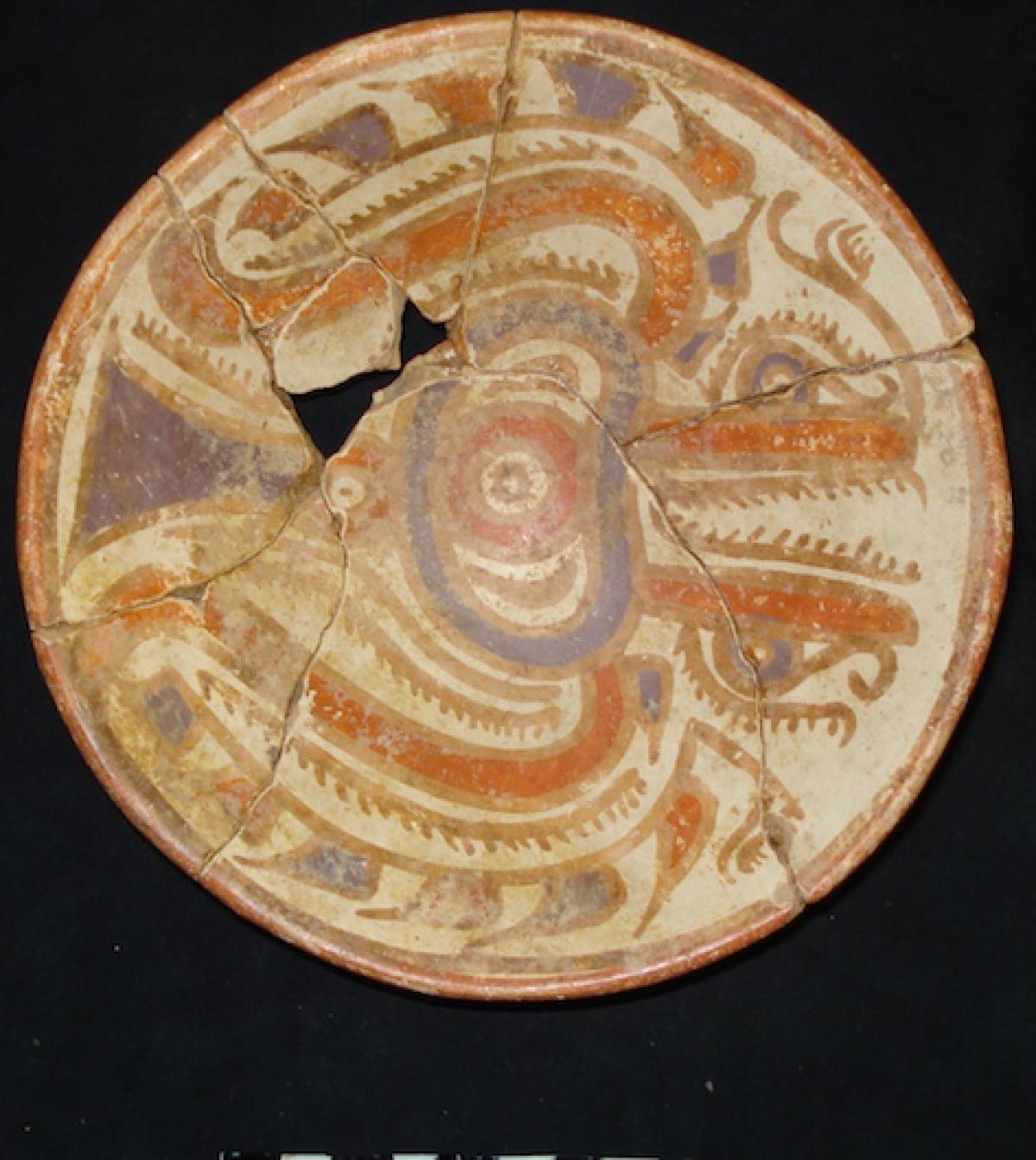 385 - Plato polícromo de borde engrosado exterior. Doble engobe (blanco en el anverso y rojo en el reverso) y decoración en bandas de color alternas zigzagueantes (rojo y morado).
