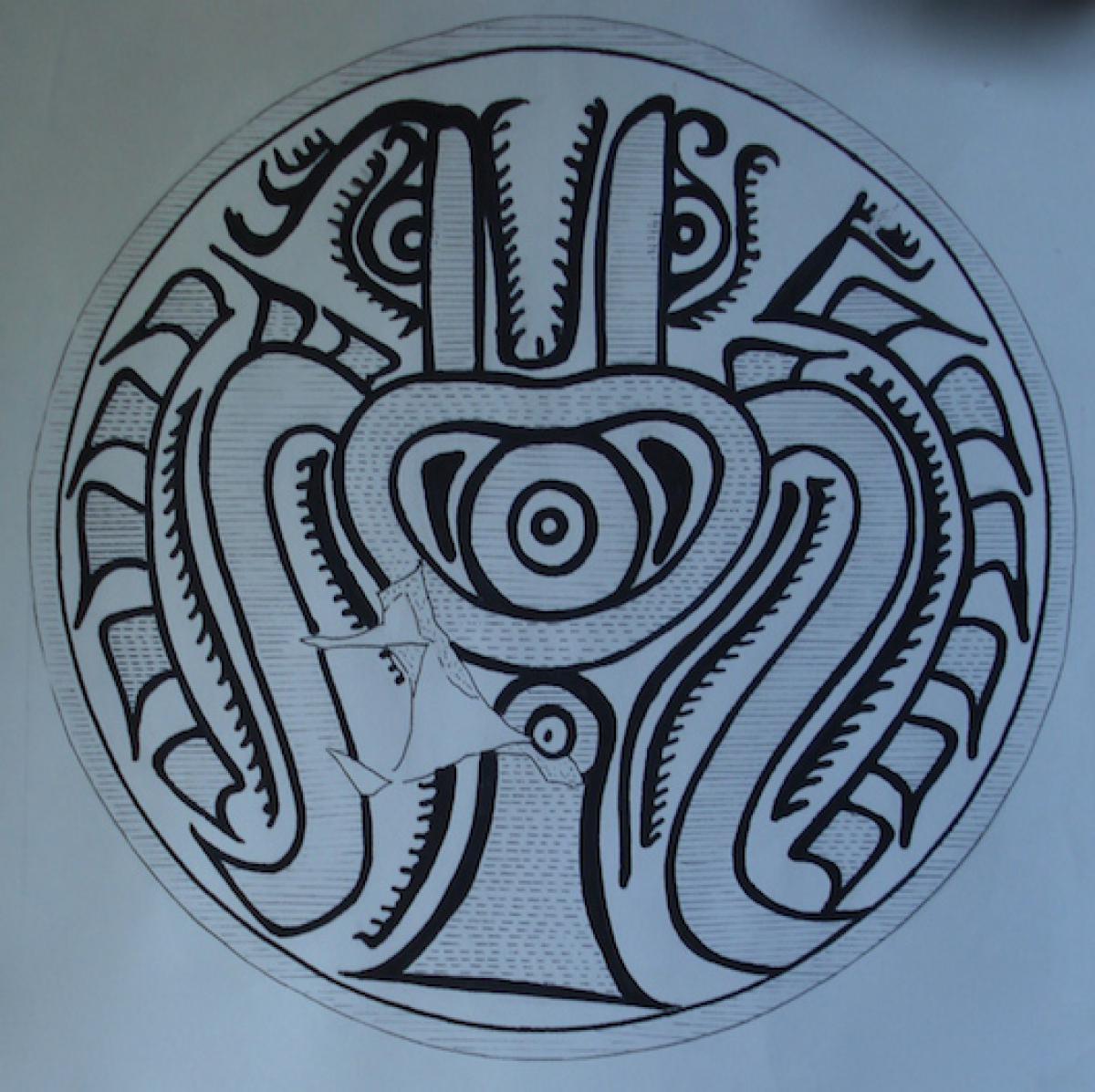 389 - Pectoral discoidal de oro repujado con la representación de un ser sobrenatural híbrido de calamar y ave. Grupo metalúrgico Conte. La figura del calamar, que es la más inmediata, ...