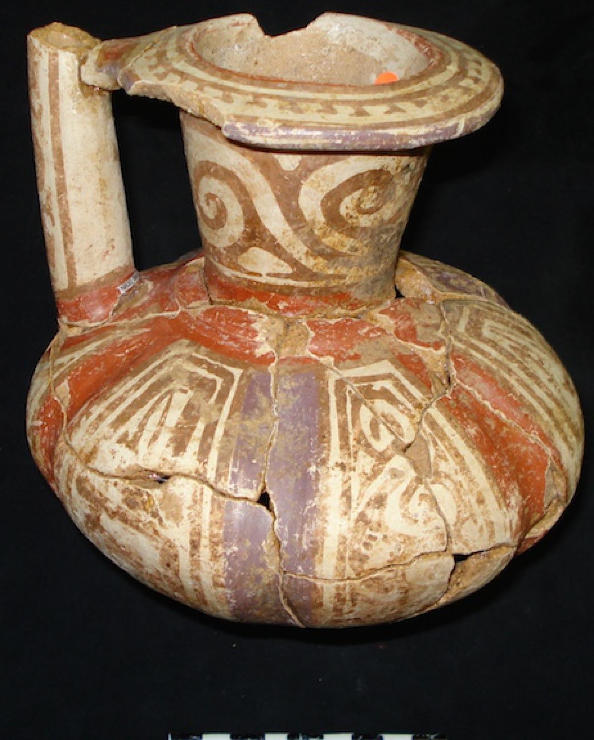 376 - Jarra polícroma carenada con hombros alzados y cuello largo. Engobe blanco y decoración de bandas de color alternas rojas y moradas.