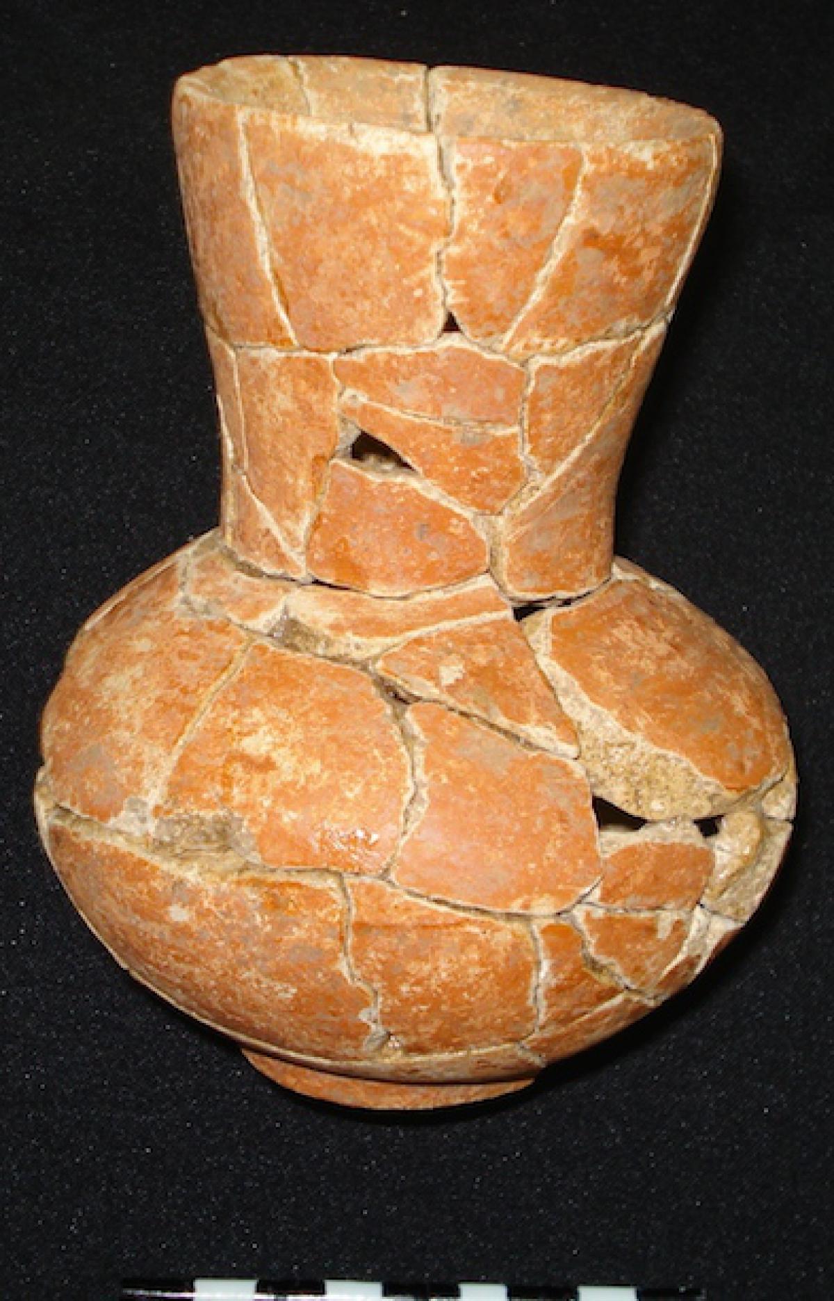 3565 - Jarra globular con base anular, cuello largo y borde recto. Engobe de color rojo en el exterior y engobe de color blanco sobre el cuello. Banda de color morado sobre el cuello.