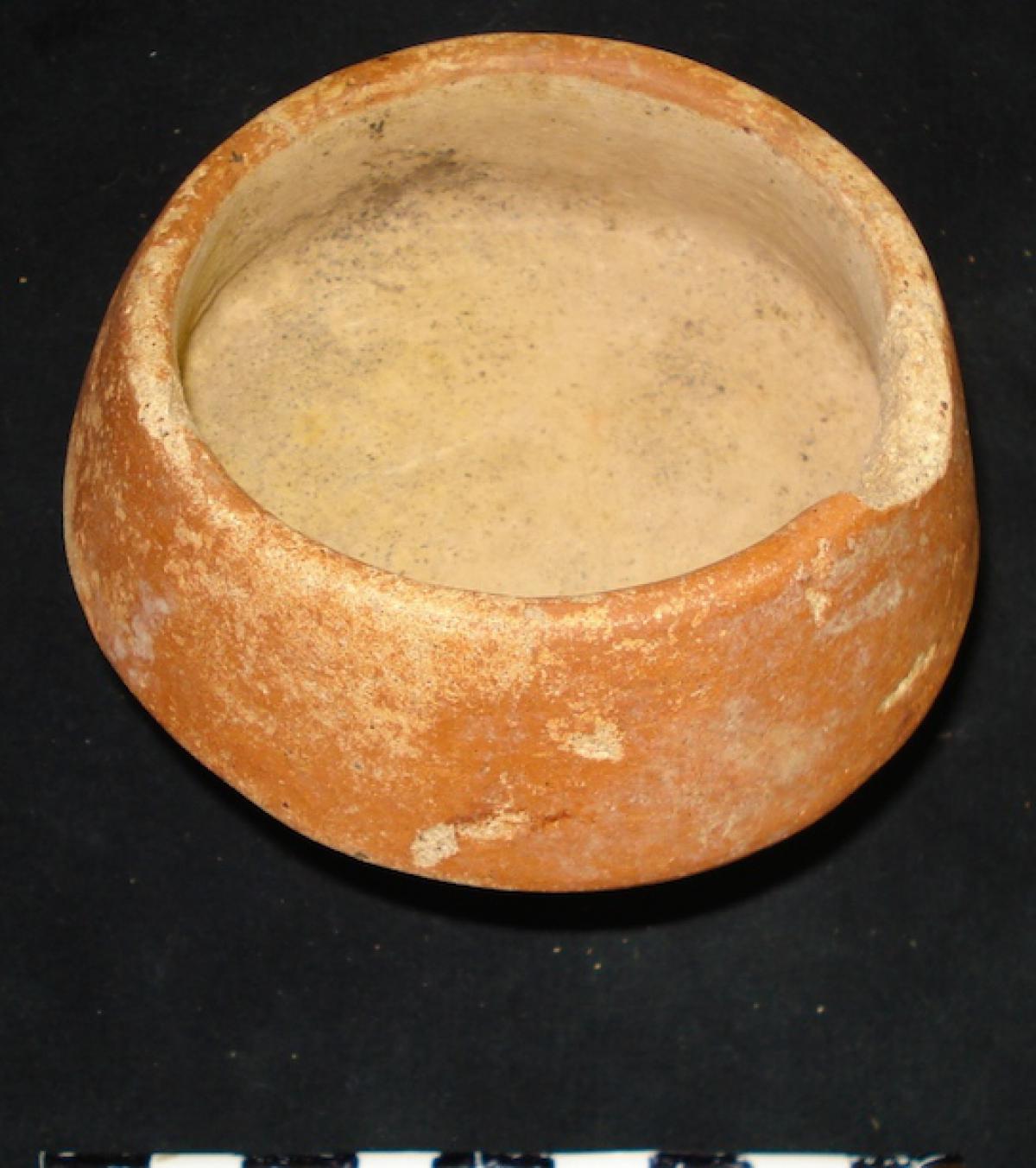 3658 - Cuenco de base plana, paredes ligeramente convexas y borde engrosado hacia el exterior, con engobe rojo externo y blanco interno, decorado con un panel central con la representación de un (...