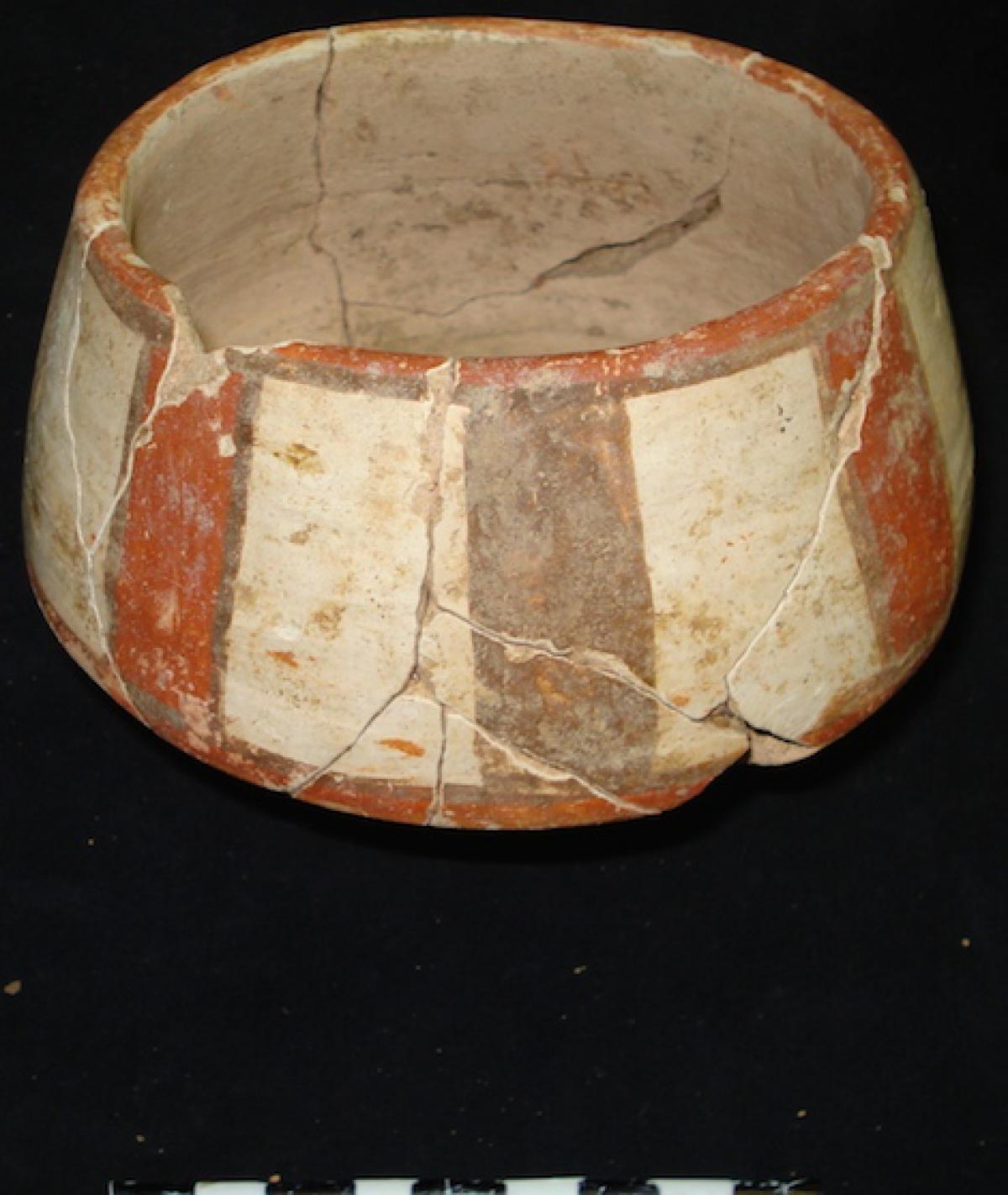 3645 - La jarra globular, sin base anular, de cuello corto y borde ligeramente convexo, posee un engobe exterior blanco decorado con bandas horizontales de colores alternos (rojo y azul) que dejan ...