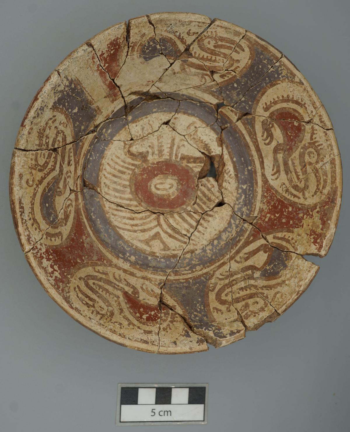 Cuenco ligeramente convexo, con base anular y borde ligeramente apuntado en el interior. Fue decorada en la parte interior y exterior. Presenta engobe blanco en el interior con patrones decorativos zoomorfos (aves) en las paredes y de cangrejo en el panel central. En el exterior se aplicó un engobe de color rojo y sobre él, a modo de lienzo, otro engobe blanco sobre el cual fueron pintadas espirales divergentes rectilíneas y curvilíneas.