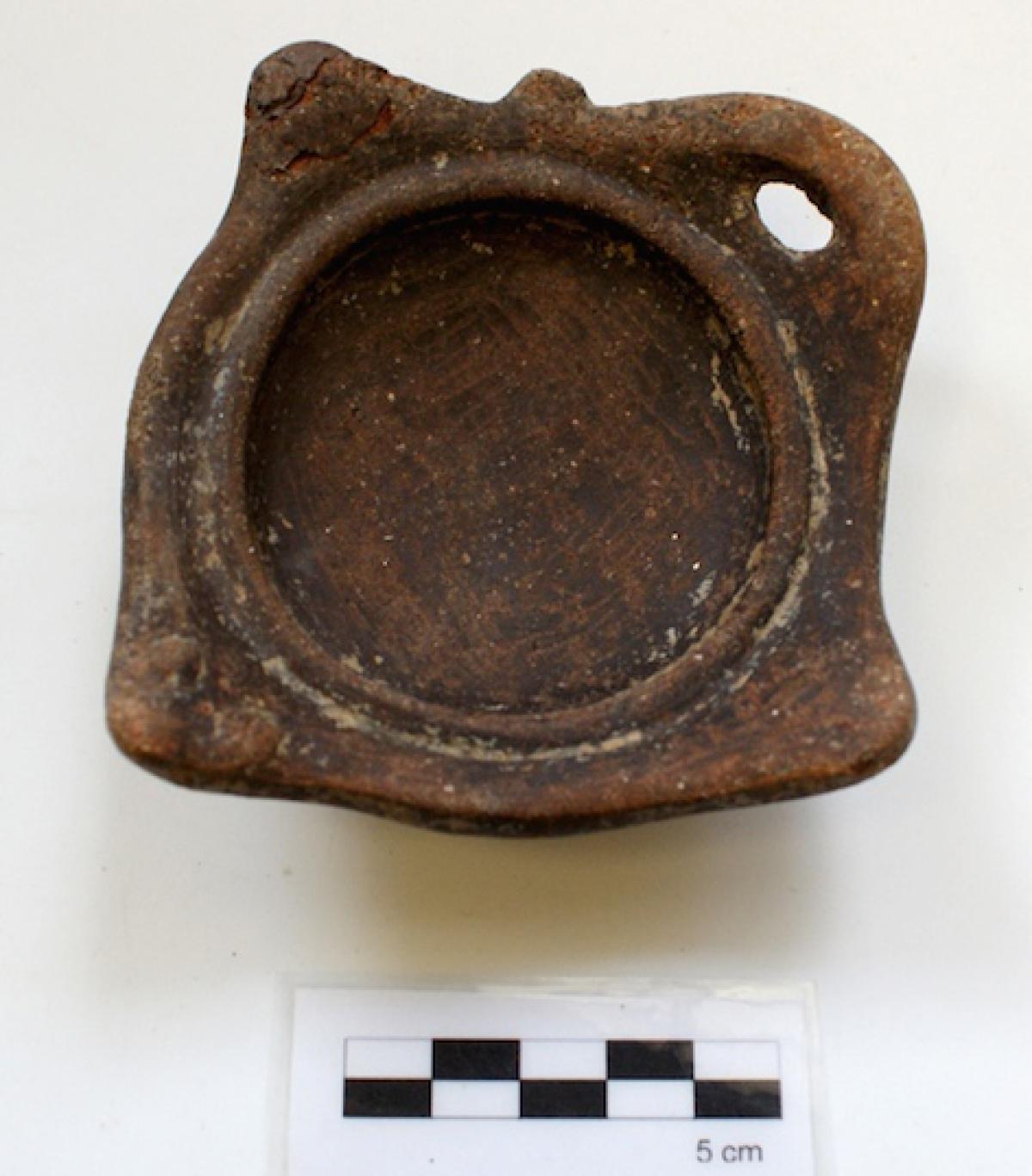 390 - Incensario o sahumerio de asa cilíndrica con englobe rojo que cubre la totalidad de la pieza. Presenta huellas de uso producto probablemente de la quema de alguna resina o semilla aromáti...