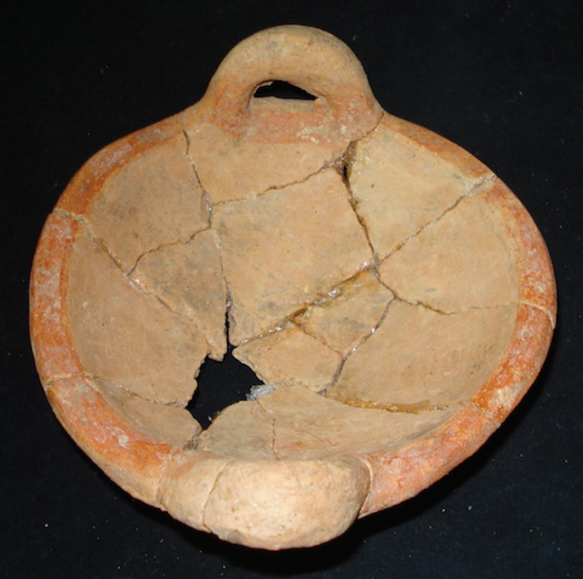 390 - Incensario o sahumerio de asa cilíndrica con englobe rojo que cubre la totalidad de la pieza. Presenta huellas de uso producto probablemente de la quema de alguna resina o semilla aromáti...