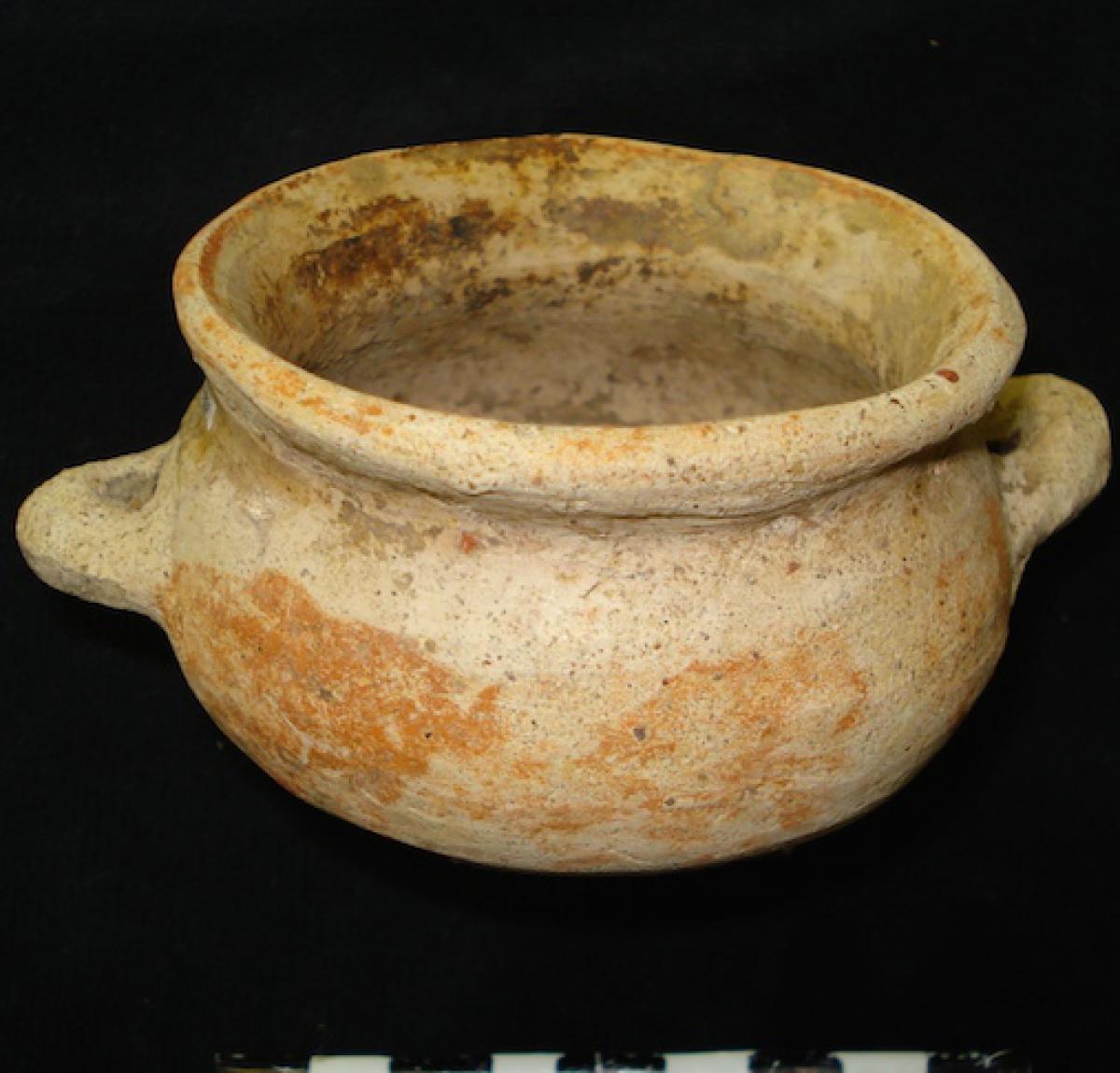 3560 - Olla con borde envesado, con línea roja y asa en el cuerpo, sin soporte.