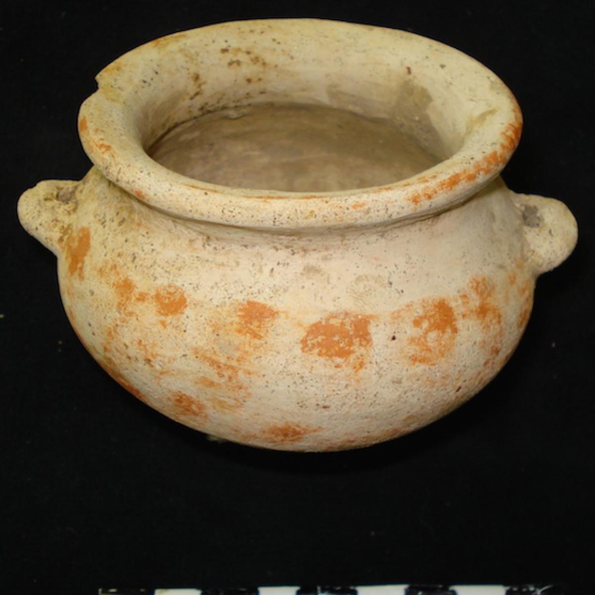 3560 - Olla con borde envesado, con línea roja y asa en el cuerpo, sin soporte.