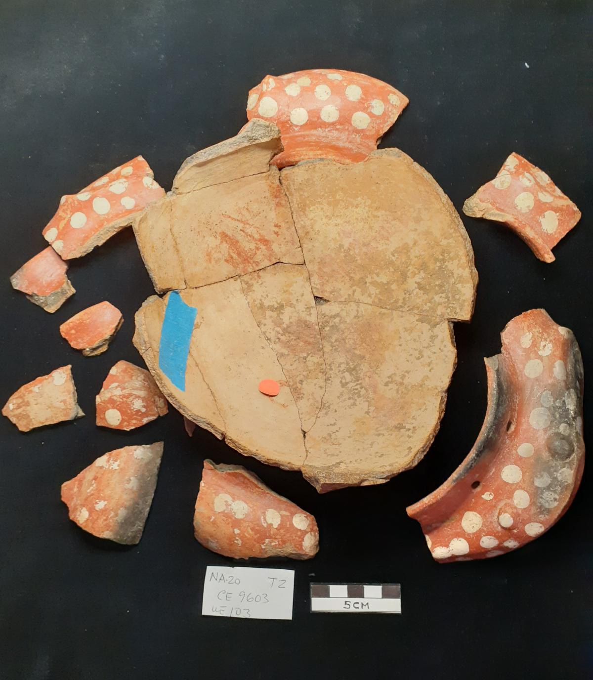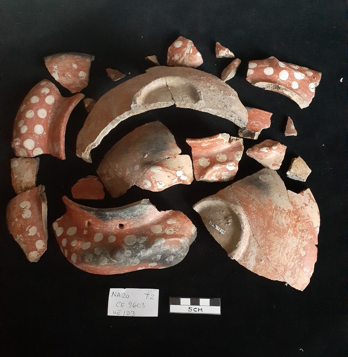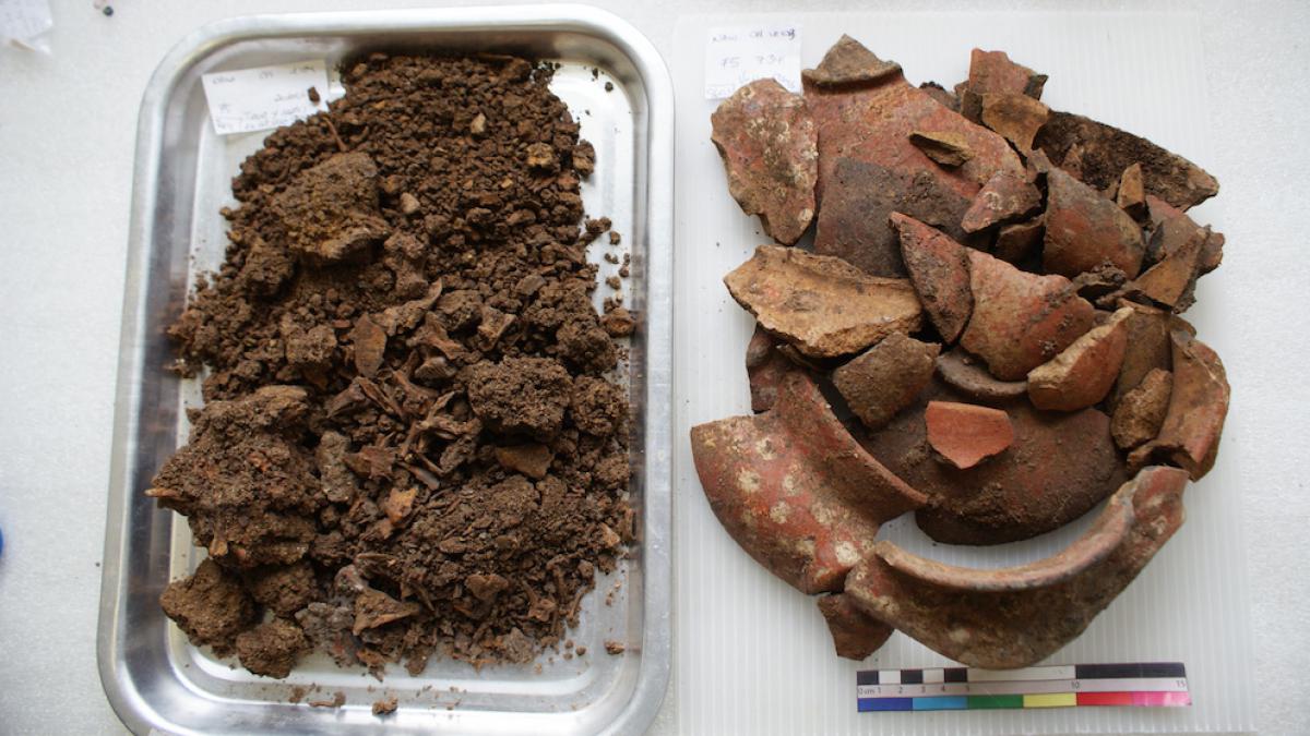 Vasija antes de ser restaurada junto a los restos de espinas encontrados en su interior. Las espinas son de dos ejemplares de Guentheridia formosa y un ejemplar de Sphoeroides annulatus.