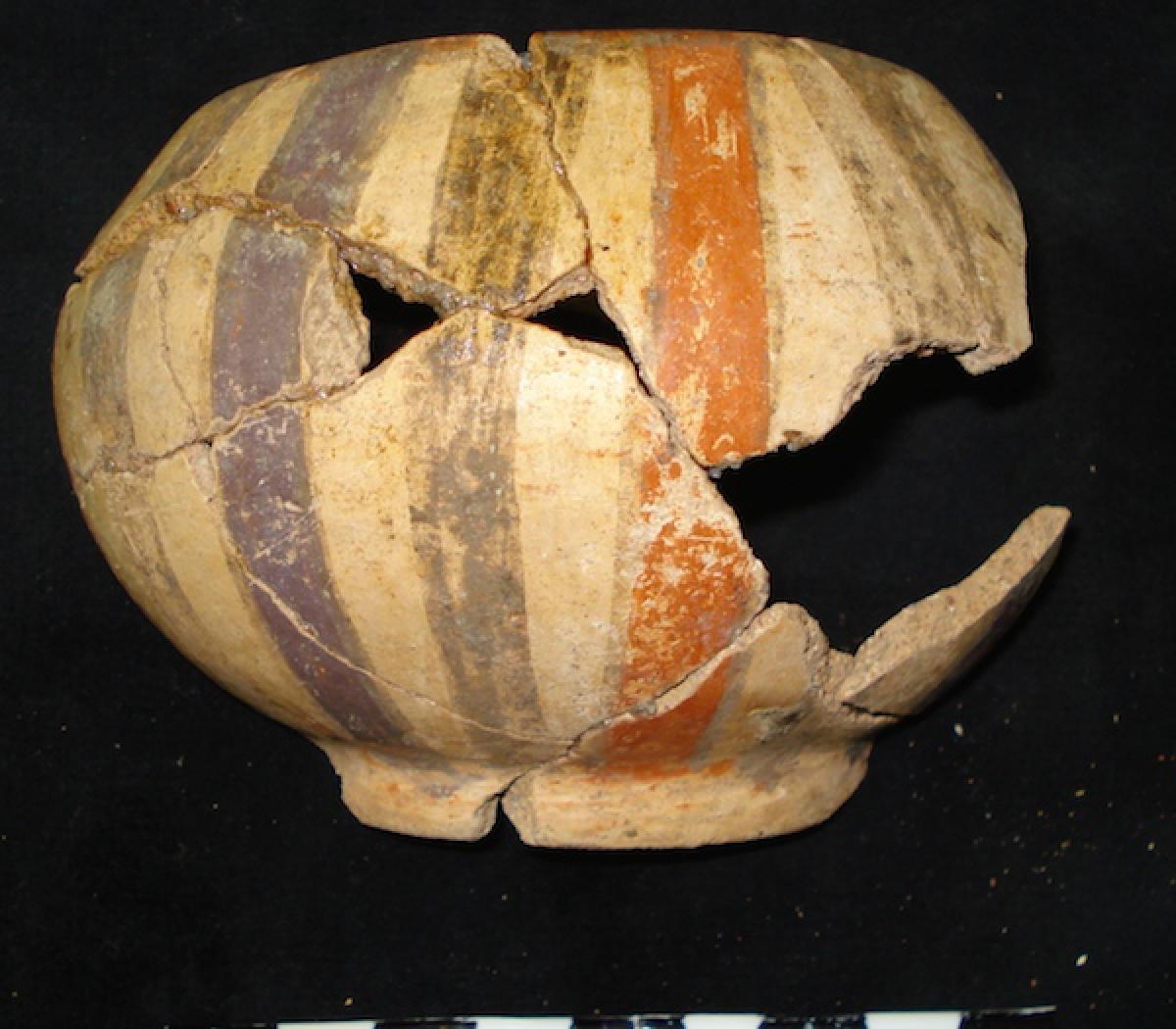 376 - Jarra polícroma carenada con hombros alzados y cuello largo. Engobe blanco y decoración de bandas de color alternas rojas y moradas.