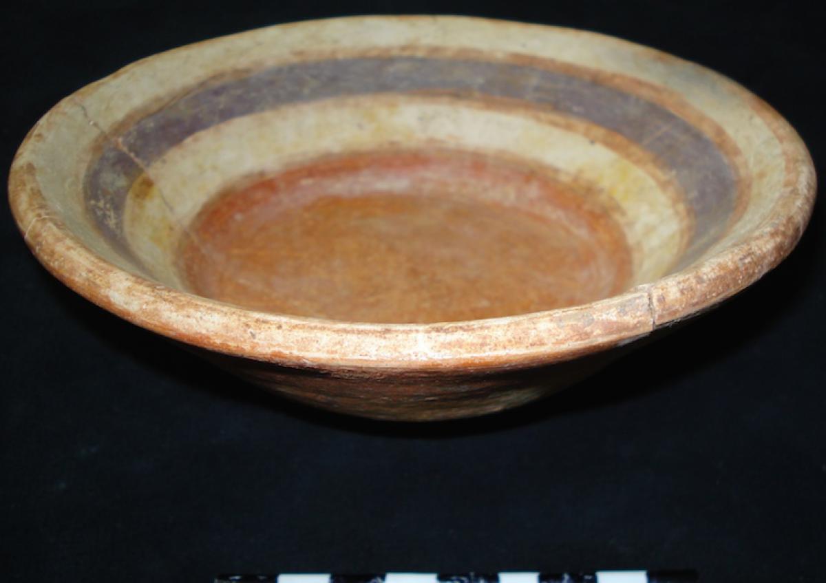 385 - Plato polícromo de borde engrosado exterior. Doble engobe (blanco en el anverso y rojo en el reverso) y decoración en bandas de color alternas zigzagueantes (rojo y morado).