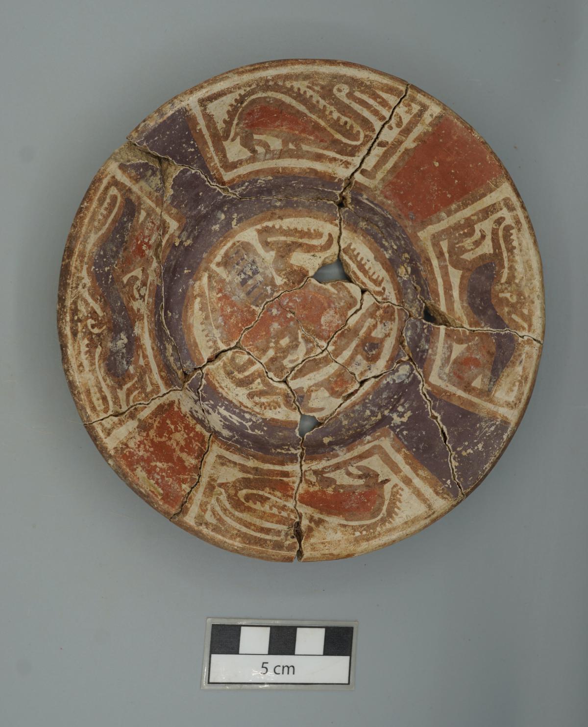3650 - Cuenco de base plana, con paredes ligeramente convexas y borde redondeado. Presenta engobe rojo en el exterior y blanco en el interior, con decoración en rojo y morado. En el panel central ...